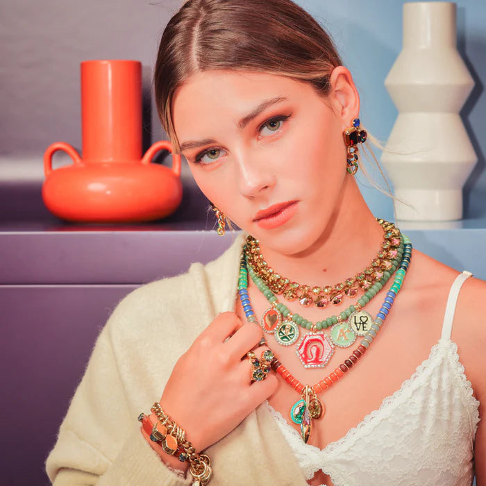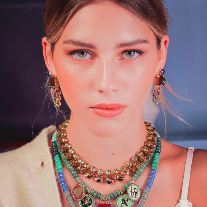 - Add a little sparkle to any outfit with these Gyda Earrings! These stunning accessories feature antique gold plating, a brass base metal, hand painted enamel and high-quality crystals. They measure 1.5"! So why not level up your look and show off your style with these fabulous earrings?