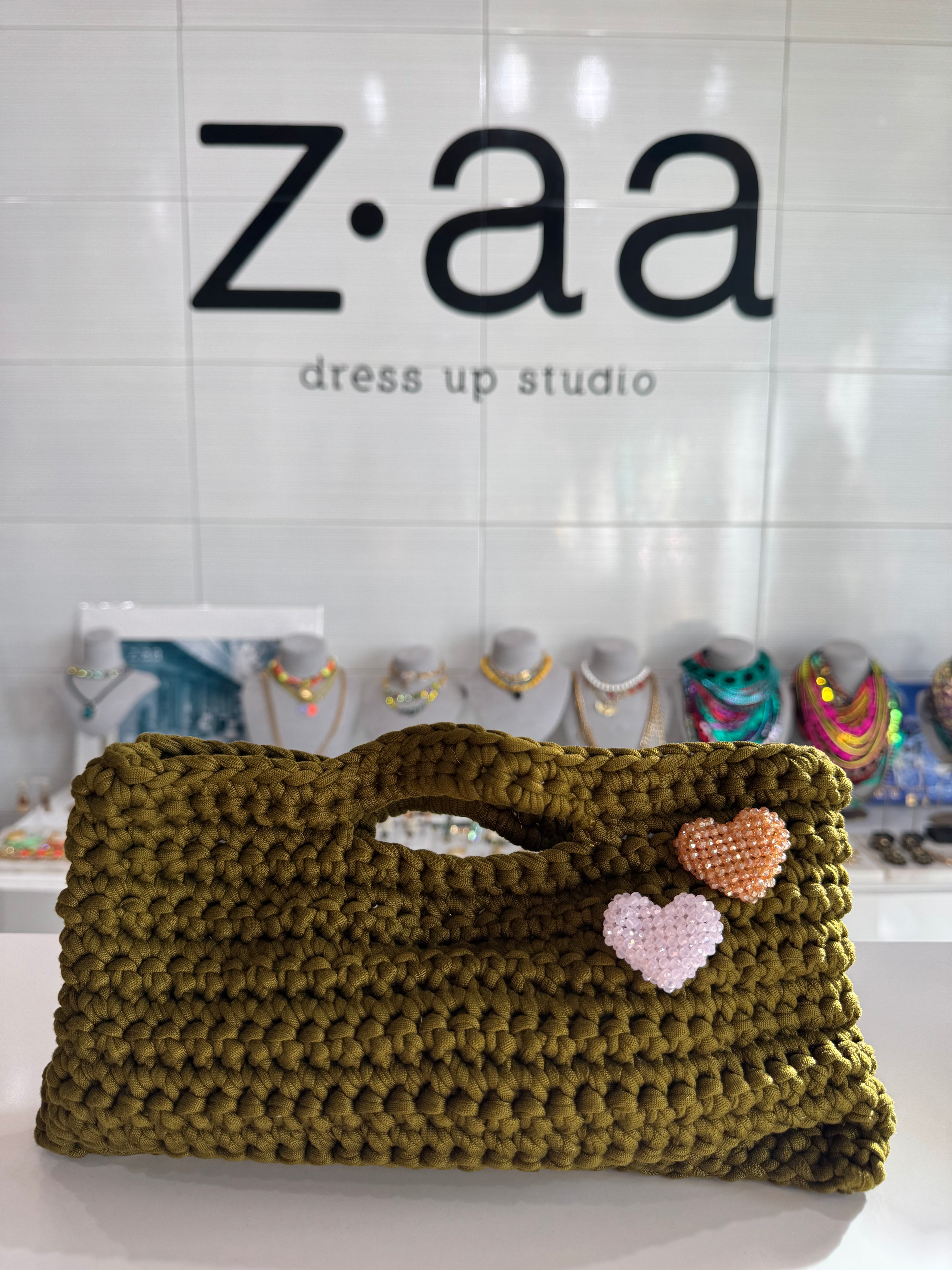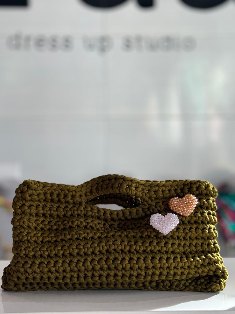 - Handmade, crochet clutch bag. It is crafted from a thick, olive-green recycled cotton yarn, giving it a distinct textured appearance. The bag features an integrated handle and is decorated with two beaded heart-shaped pins (one light pink/rose gold, one white/silver.
