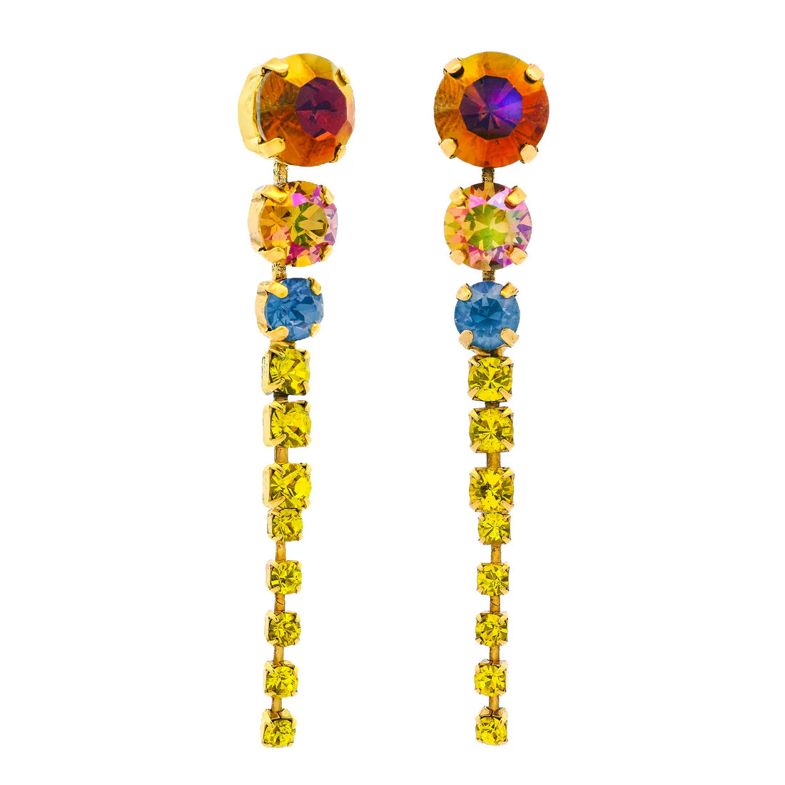 - Introducing Ingrid Earrings - the perfect mix of elegance and edginess! These antique gold plated earrings feature high quality crystals and hypoallergenic surgical steel posts for a comfortable wear. Measuring 2.25" in length, these brass base metal earrings are just what you need to elevate your look.