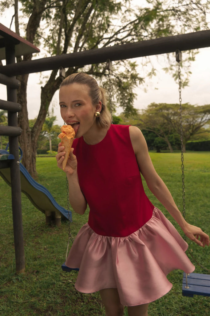Short, bold, and unforgettable — Fresa Eléctrica is a mini dress designed to make an impact. It features a sleeveless structured bodice in double crepe and a playful bubble skirt in mikado that bounces with every step. The mix of textures and colors turns it into a true statement piece. Available in strawberry/pink, all black, black/ivory, and all ivory.