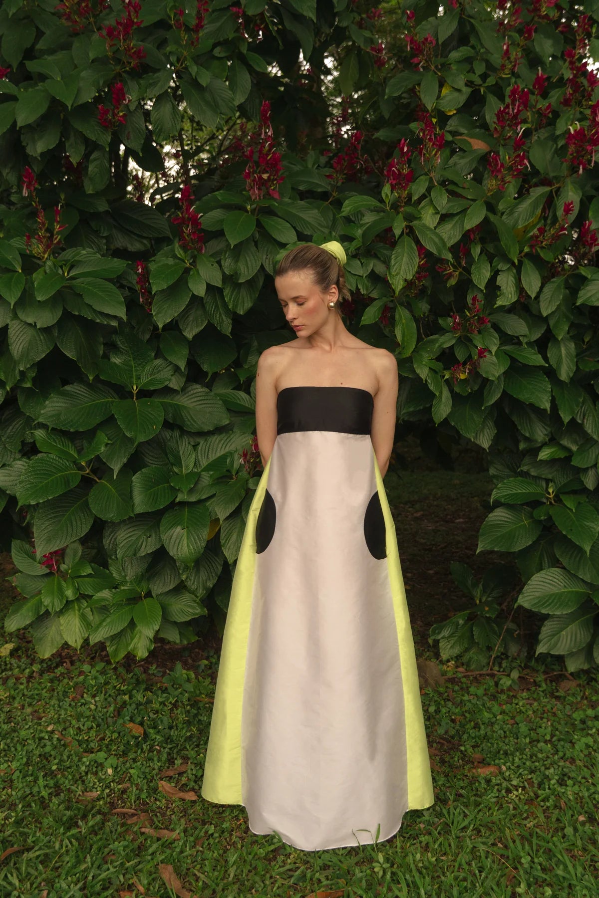 Bold, vibrant, and charmingly playful — Moon Lemonade is a strapless color-blocked dress that evokes the sun shining beneath the moonlight. Crafted from structured taffeta, it features a black bodice, ivory body, and lime green side panels. Its contrasting circular black pockets add a fun, unique twist to the silhouette.