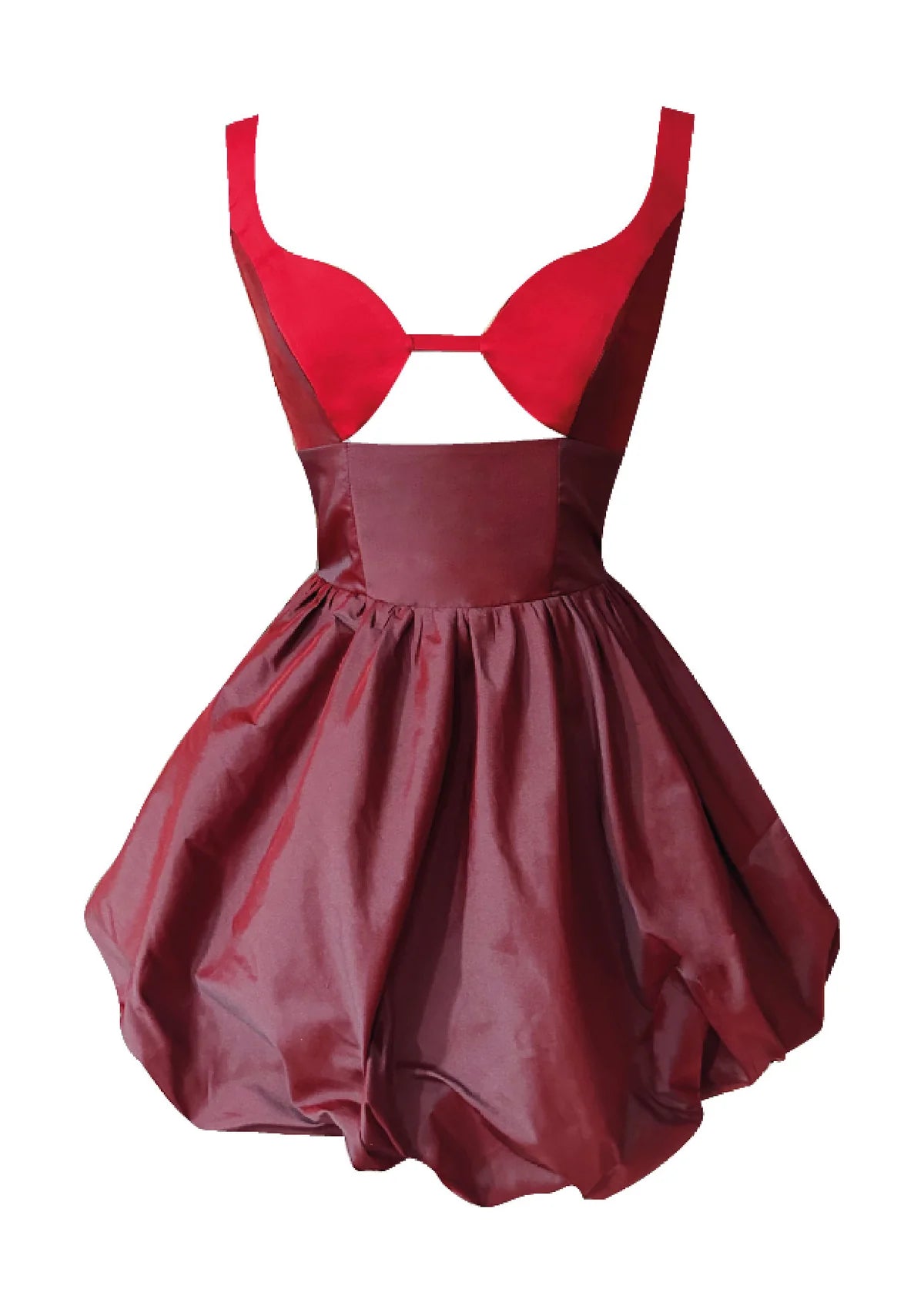 - This bubble mini dress is the perfect choice for your cocktail parties and festive events. Featuring a cutout under the bust and a cinched waist, it offers a flattering and structured fit. The design showcases the brand’s signature color blocking, adding a touch of elegance and distinction. The skirt includes practical pockets, blending style and functionality. A must-have piece for any special occasion where you want to look spectacular.
