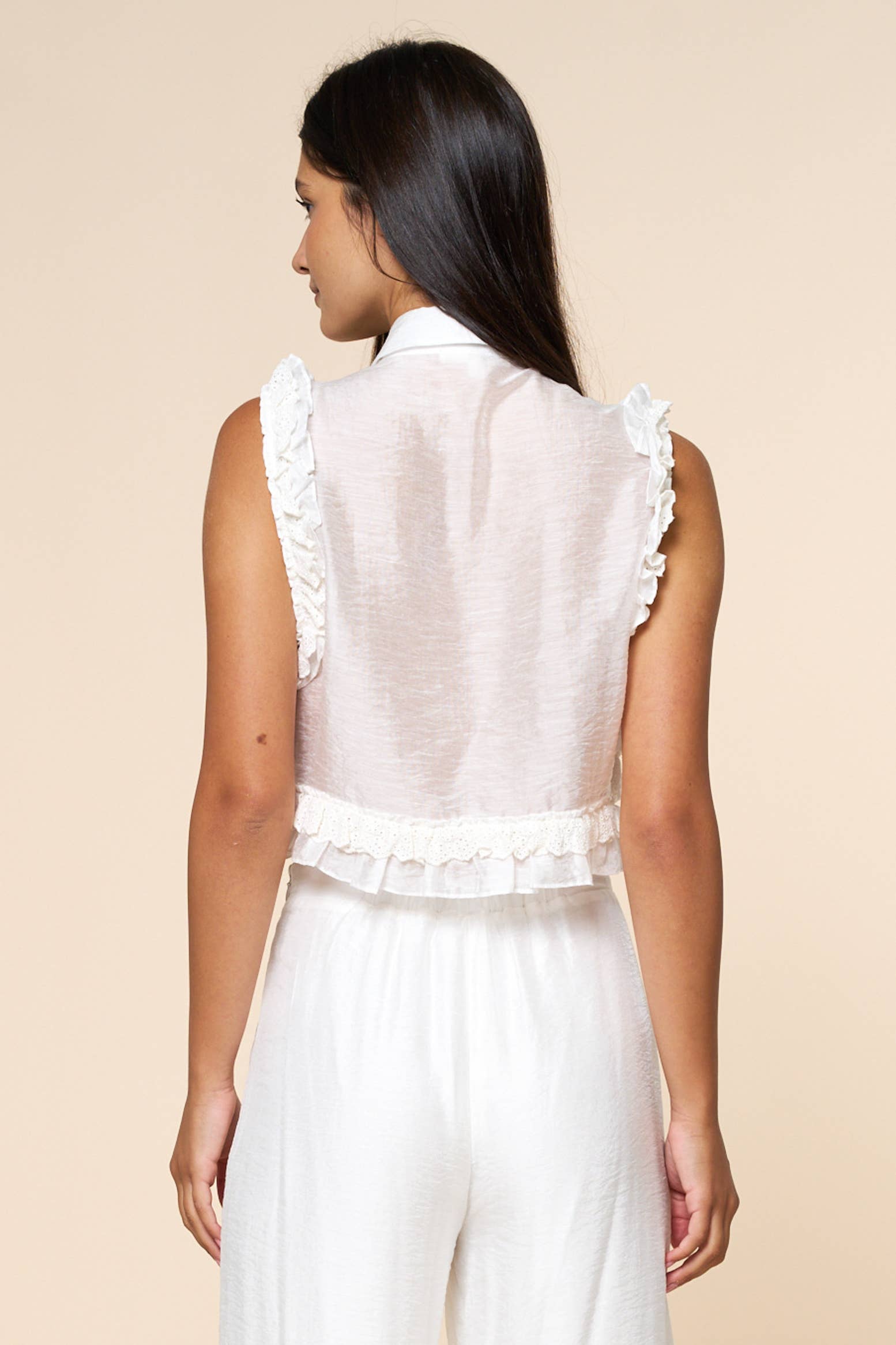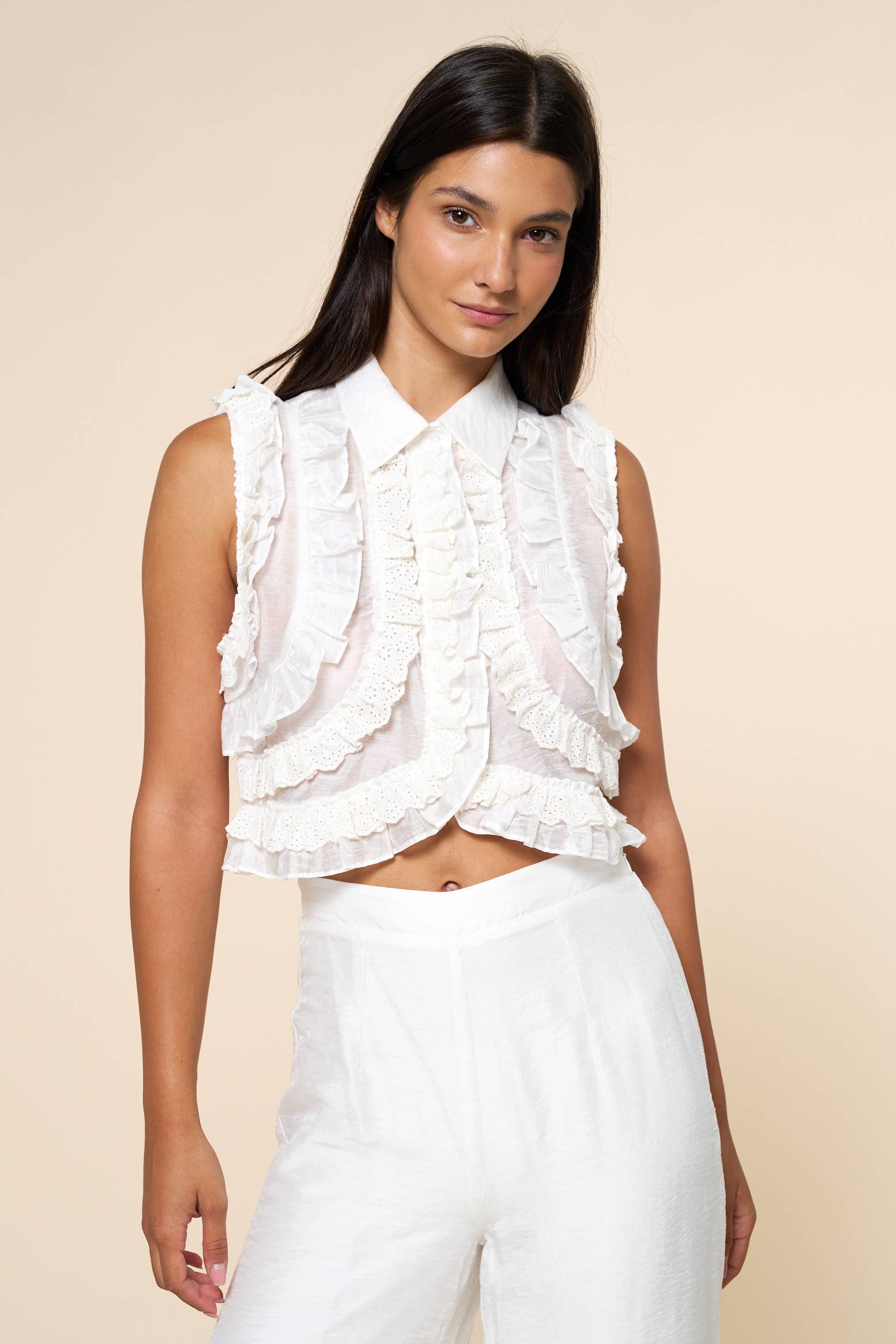 - This button down crop top features a classic collar, sleeveless design, and a playful ruffled hem. A fresh contemporary piece perfect for warm weather styling. Matching bottom sold separately.
