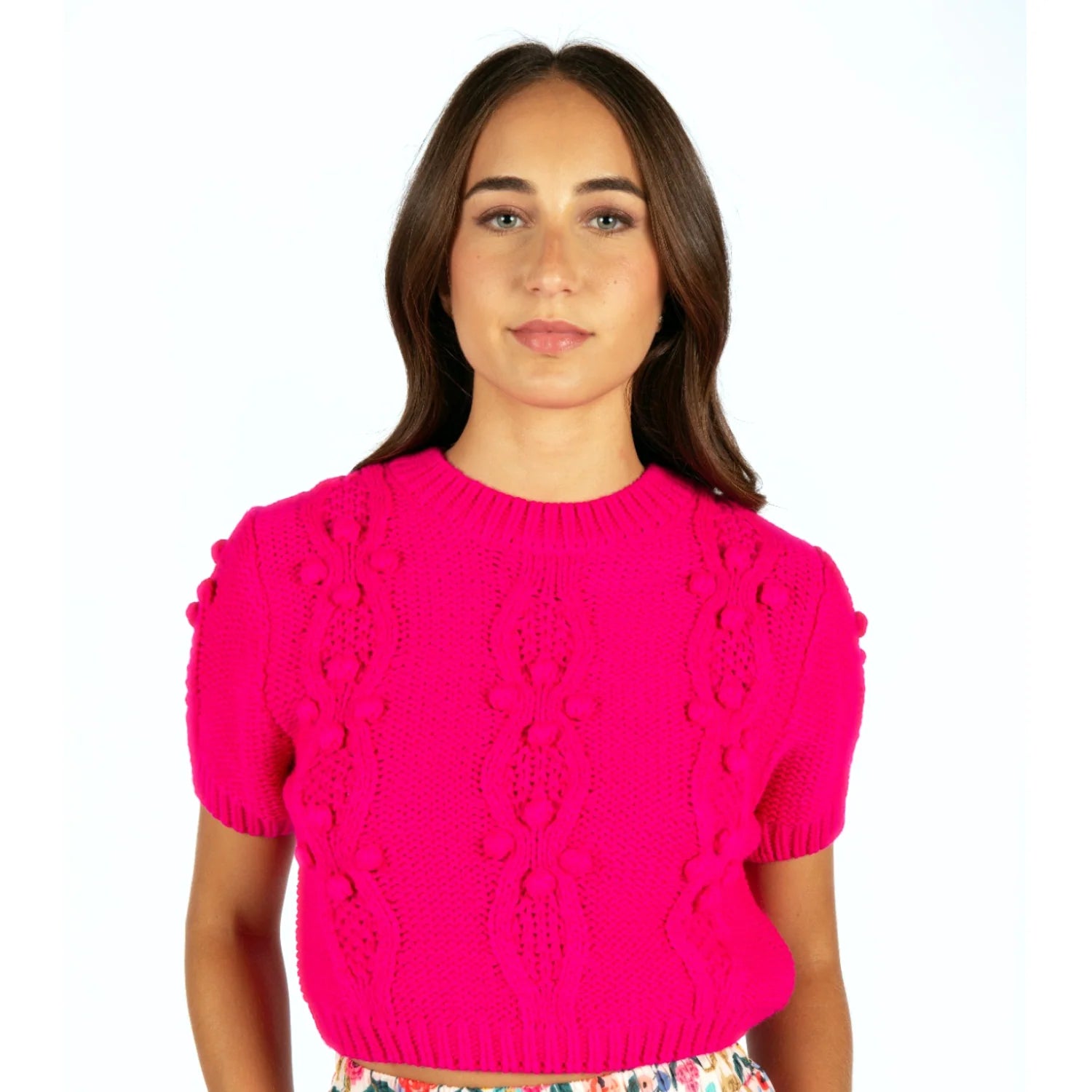 - Sweet, charming, and impossible to ignore - our Selfie Sweater makes a vibrant statement in fuchsia. Designed with an intricate cable knit pattern, this cropped sweater brings a perfect pop of color to your wardrobe. The puff sleeves and dimensional details add a romantic touch to this must-have piece. Pair with high-waisted jeans, skirts, or shorts for the perfect Instagram-worthy look! This versatile piece takes you from brunch to a girl's night with effortless style.