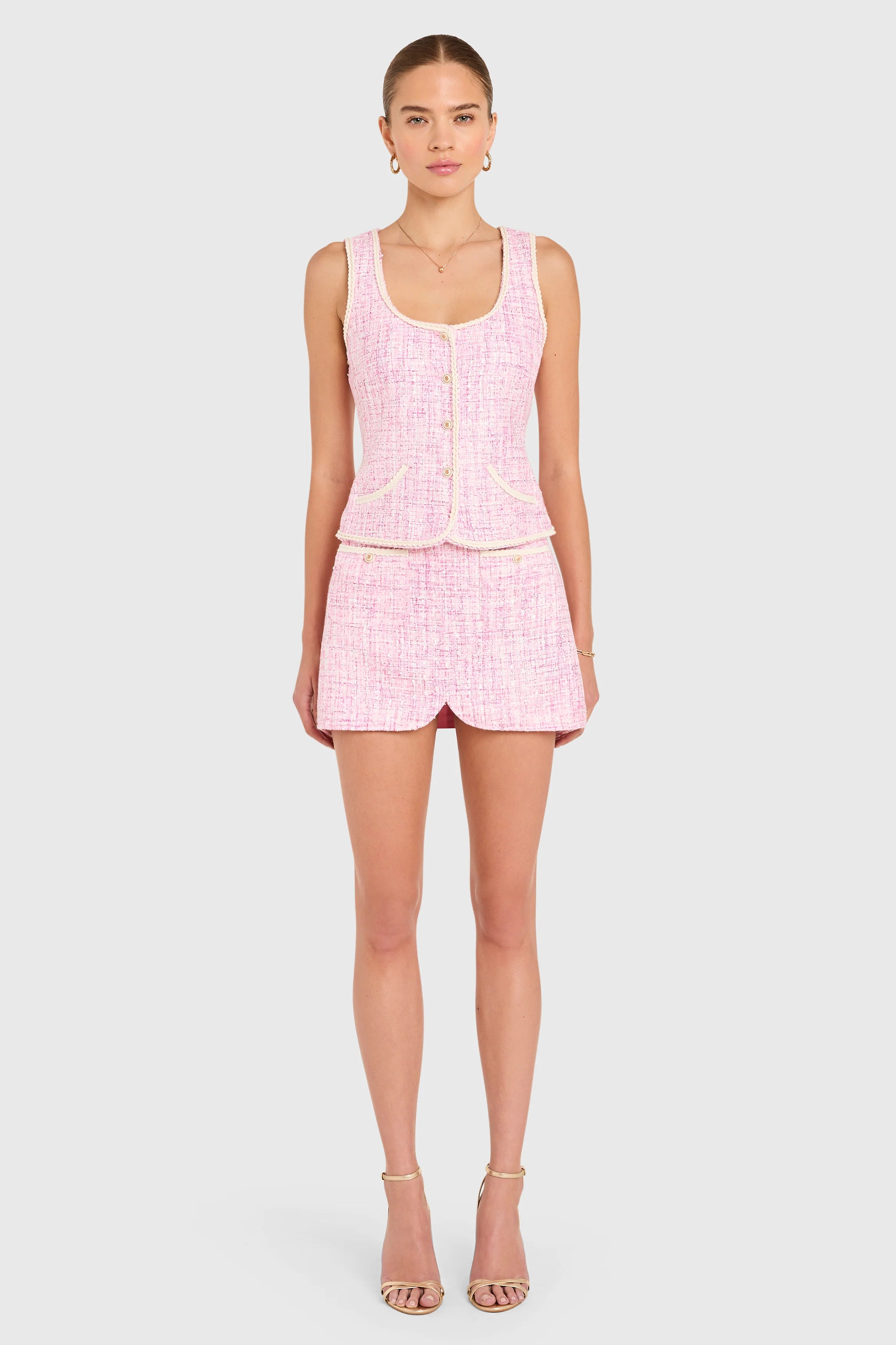 Stand out in the Caligari Vest. This scoop-neck sleeveless design is detailed with pockets and charming gold buttons for a refined touch. Pair it with the Caligari Skirt for a polished, timeless set.