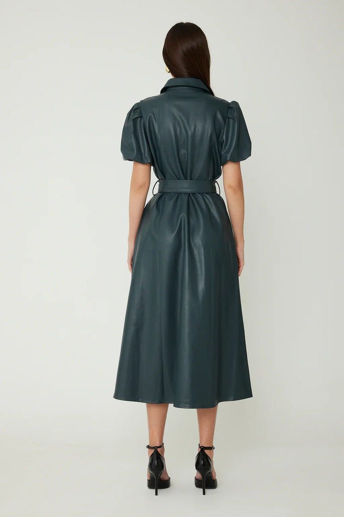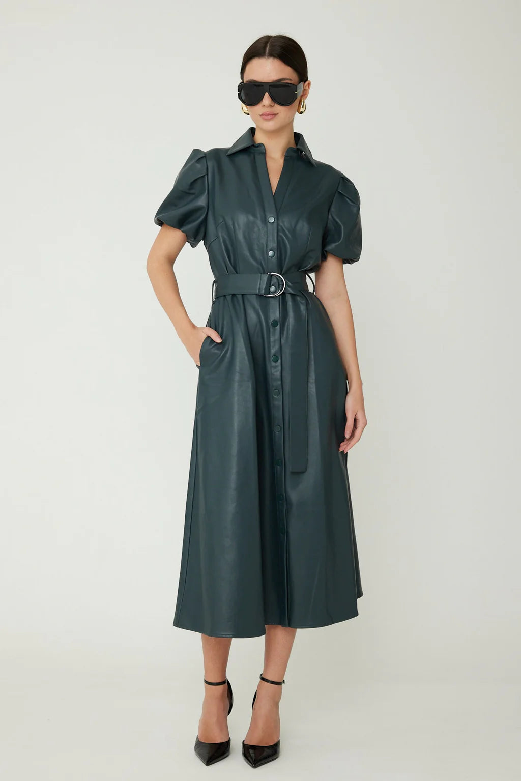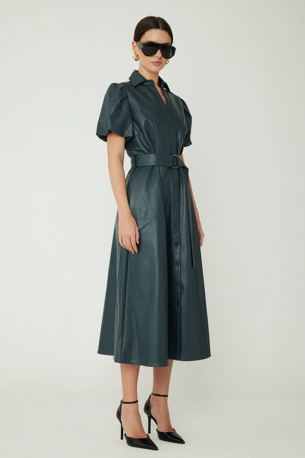 - The Laurie dress in faux leather is a timeless addition to your closet. Its fashionable pine hue is perfect for the autumn season. Delicate puffed shoulders add an elegant femininity, while the included D-ring belt lets you define your waist for a polished shape and silhouette.