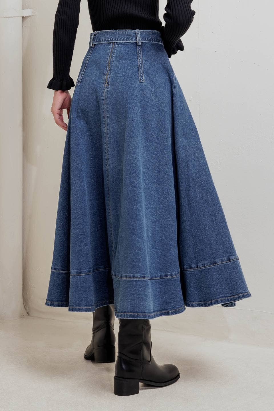 • A washed denim midi skirt featuring circle skirt, self belt, uneven hemline and back zipper closure.