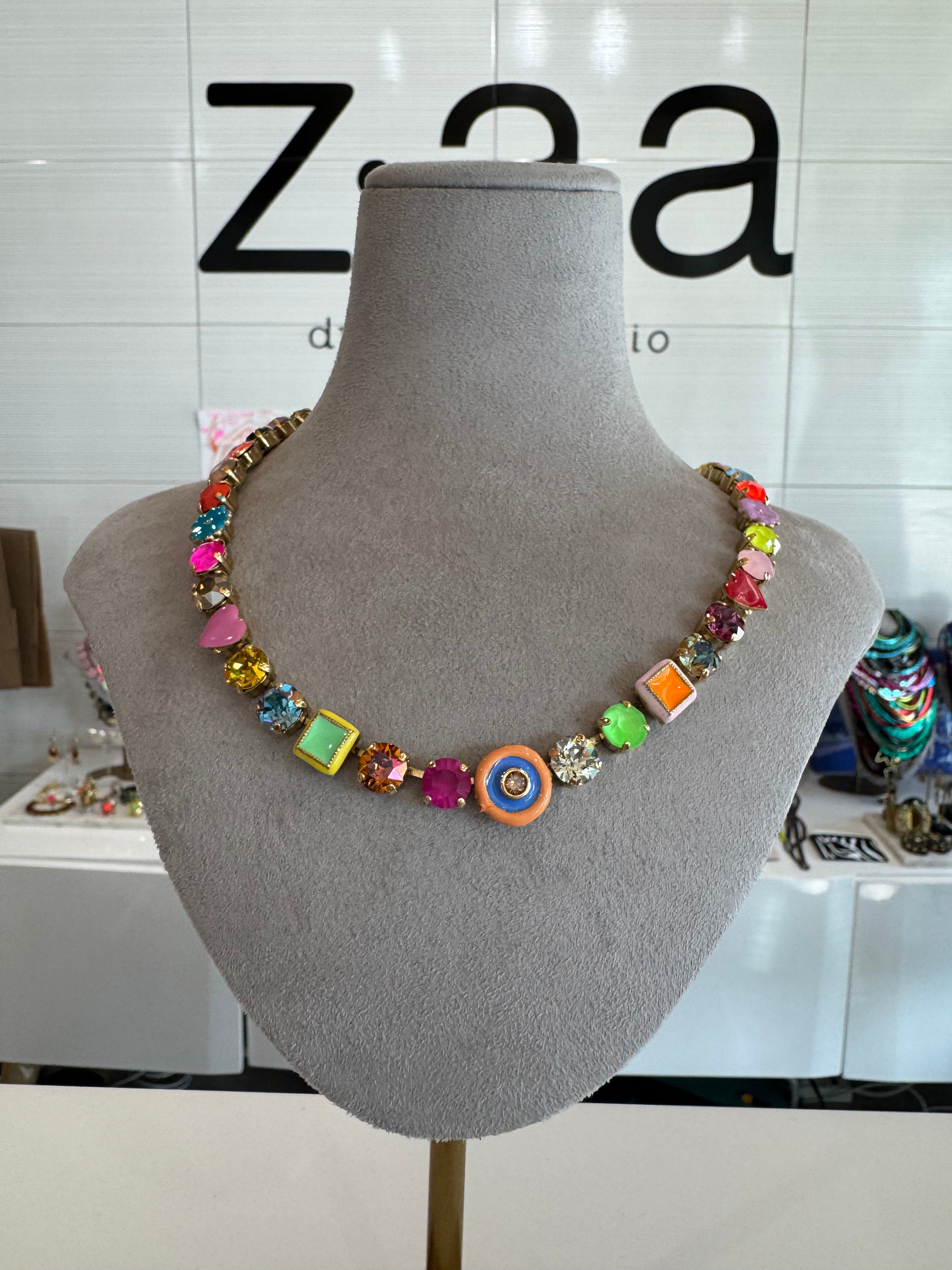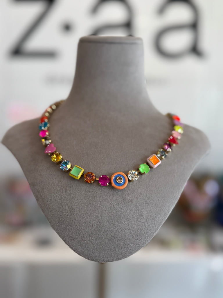 - Make a statement with this Bettina Necklace! Show off your personality with its antique gold plated brass base metal, high quality crystals and hand painted enamel. 14.5" in length and 4" extension.
