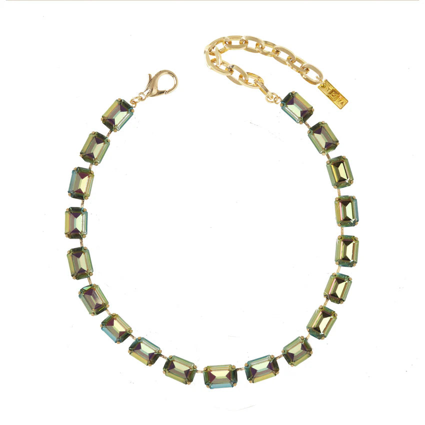 - Bring some sparkle to your look with the Jabari Necklace in Blue/Emerald! This eye-catching and dazzling piece offers an antique gold plated brass base metal with high-quality crystals, and an adjustable length of 12.25" with a 3.5" extension. Made in Canada, this fabulous piece is sure to jazz up any outfit!