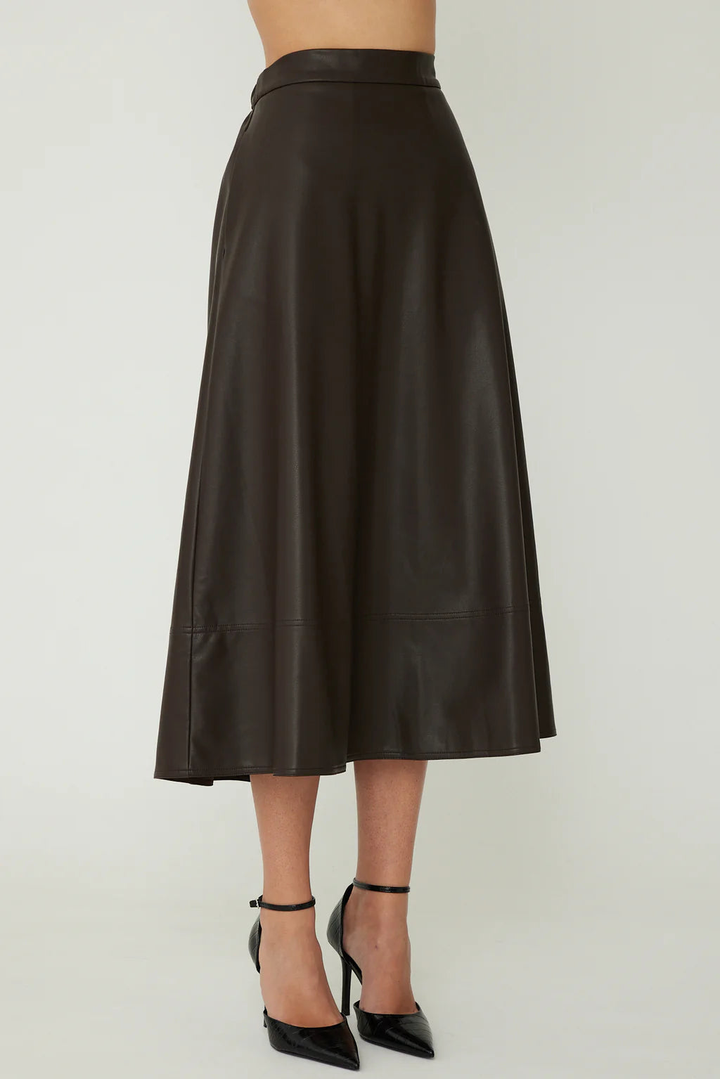 - The Laurent skirt features a faux leather construction in a rich mocha shade perfect for autumn. Designed to sit snugly at the waist, it gently flares out at the hem, offering an elegant and flattering shape. Pair it effortlessly with your preferred blouse or complement it with the coordinating ‘Mina Top’ for a polished look.