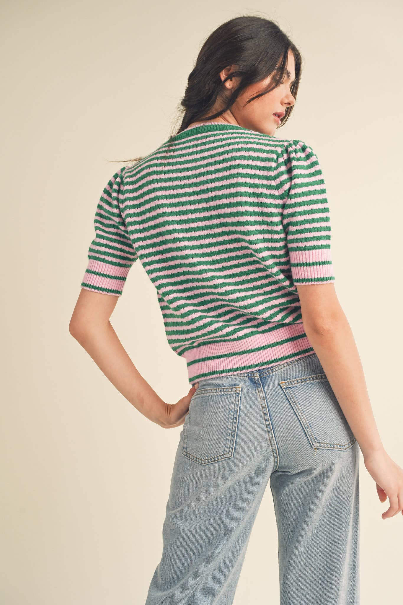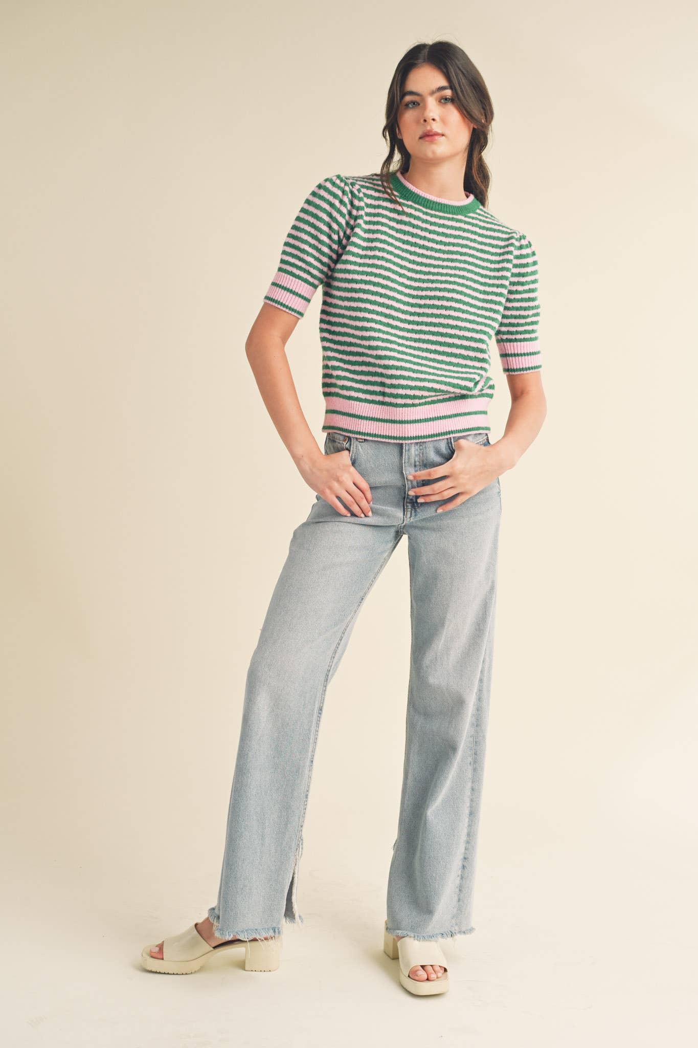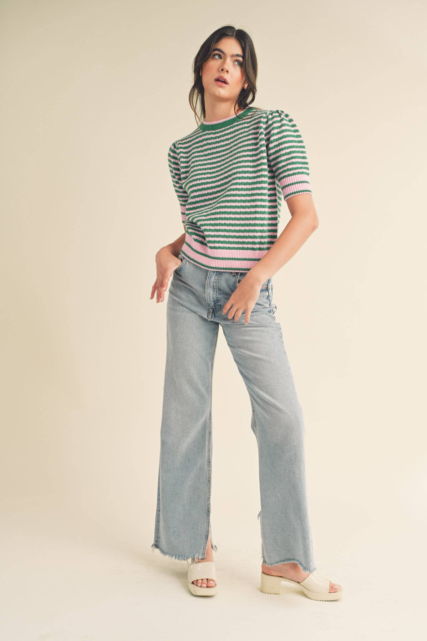Sophistication is always in style and this striped short puff sleeve sweater top is exactly what you need! This stretchy and cozy striped sweater top (with pierced pointelle throughout) features a classic crew neckline and comfortable short puff sleeves. Contrasting ribbed knit accents the neckline, cuffs, and hem. The semi-fitted bodice falls to the perfect tuckable length for all your high-waisted favorites! + Striped pointelle knit puff sleeve sweater + Round neckline + Short puff sleeves with ribbed cuffs + Gathered puff shoulders + Ribbed neckline, cuffs, and hem + Pierced pointelle throughout + Semi-fitted bodice + Model is 5' 10.5” 32-24-36 and wears a S