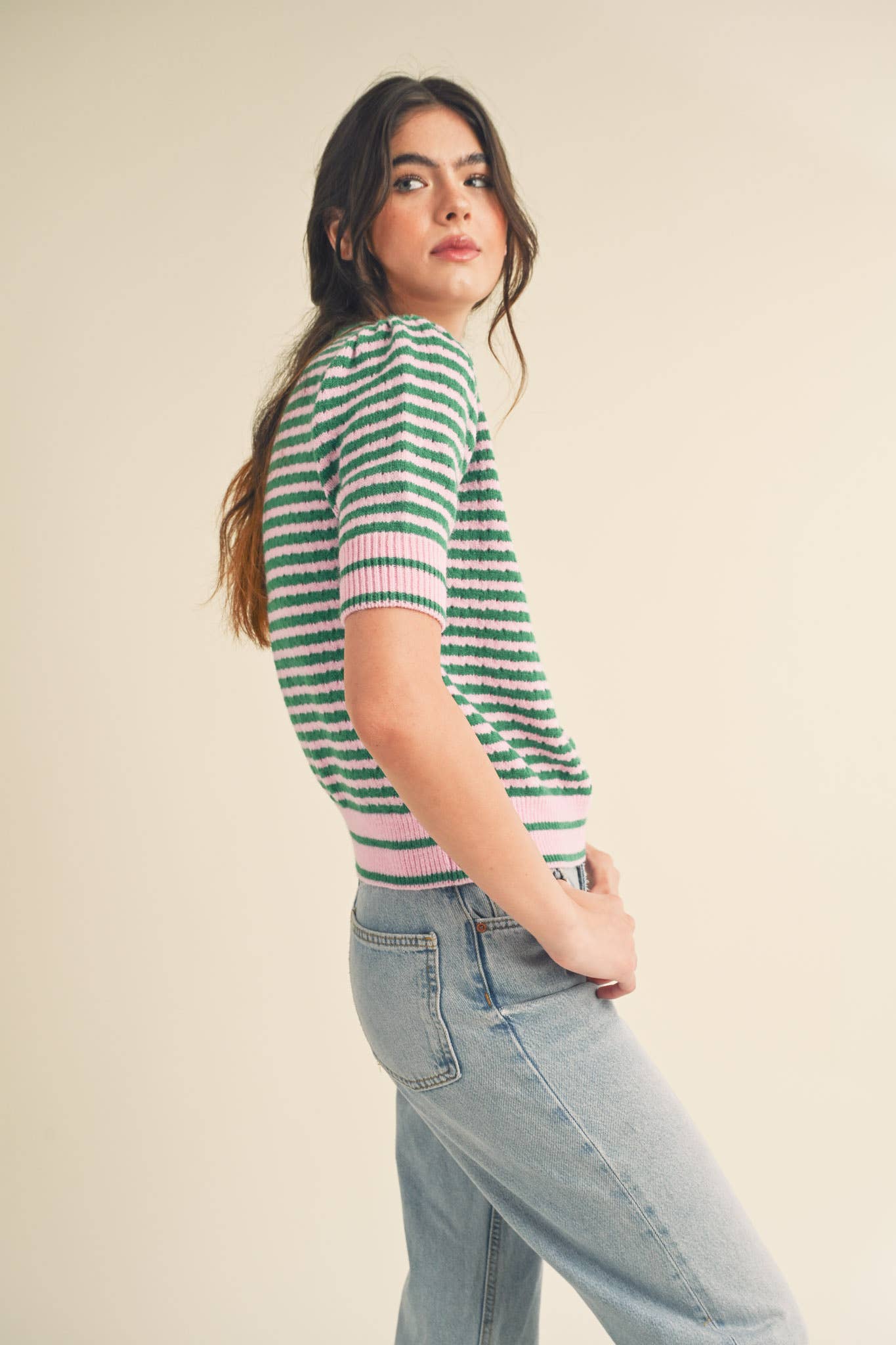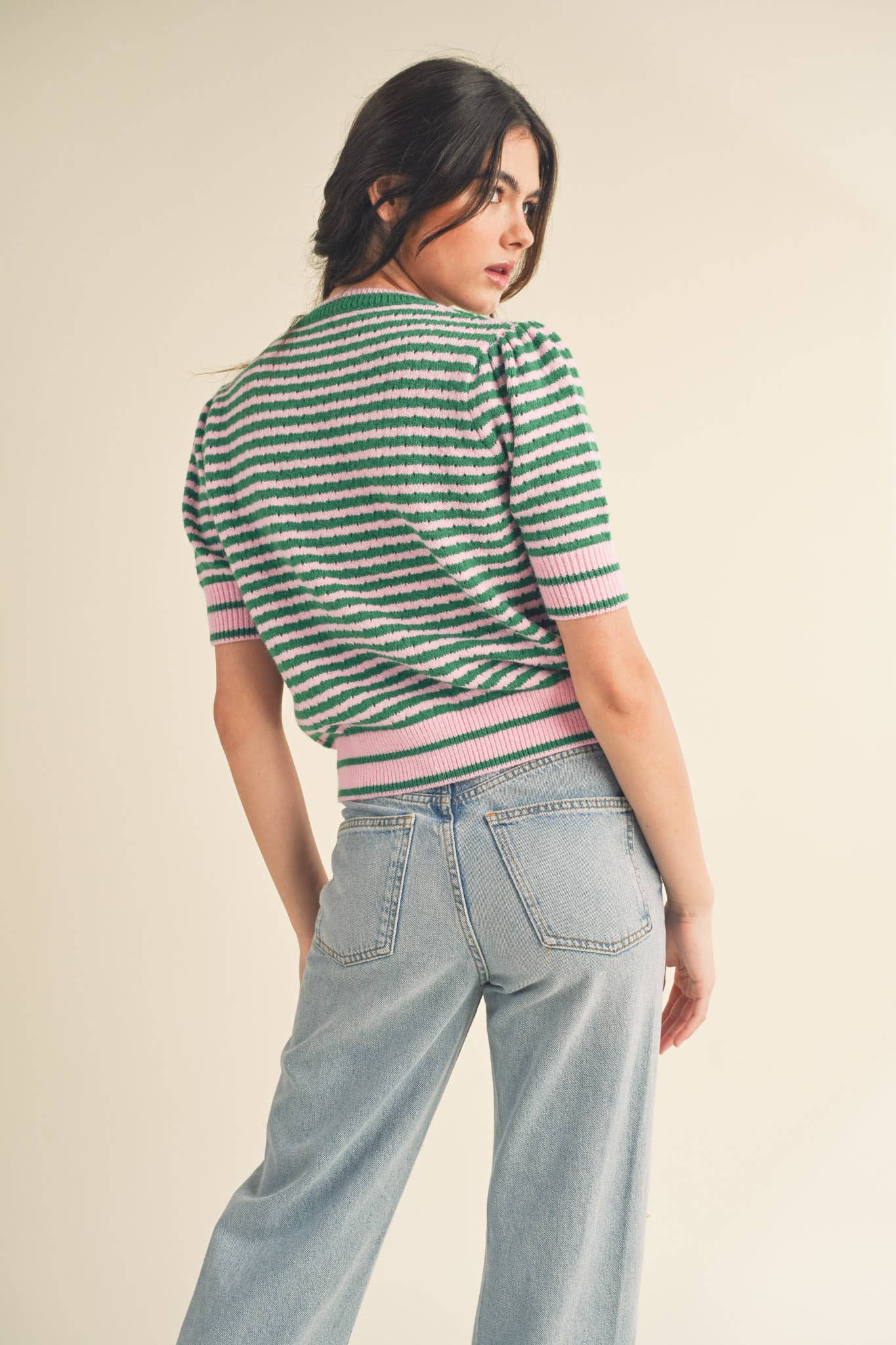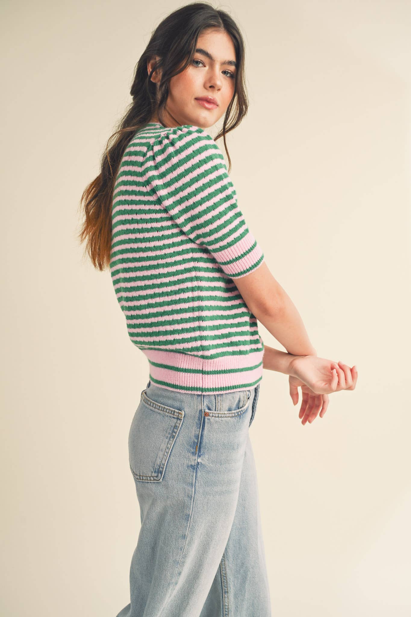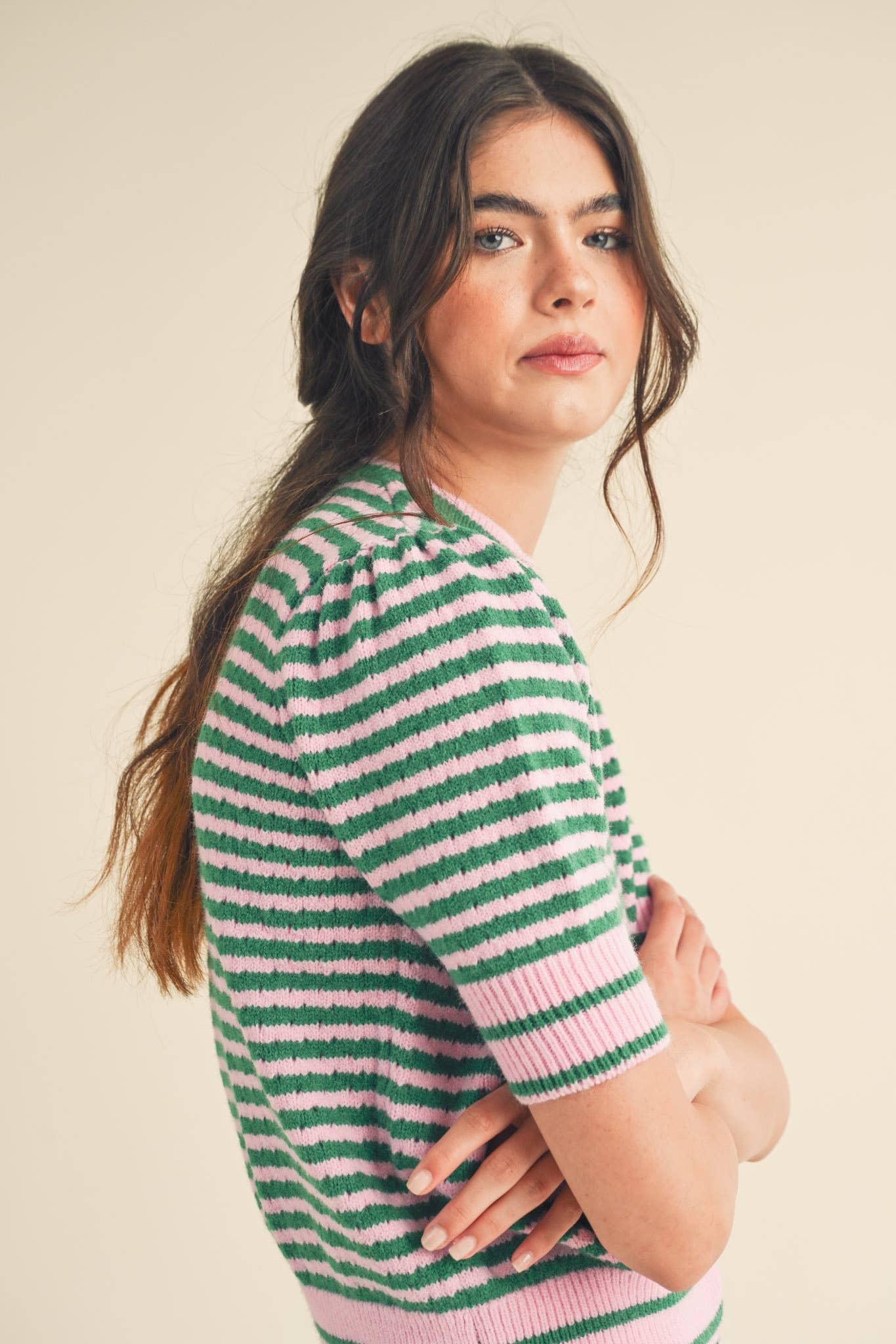 Sophistication is always in style and this striped short puff sleeve sweater top is exactly what you need! This stretchy and cozy striped sweater top (with pierced pointelle throughout) features a classic crew neckline and comfortable short puff sleeves. Contrasting ribbed knit accents the neckline, cuffs, and hem. The semi-fitted bodice falls to the perfect tuckable length for all your high-waisted favorites! + Striped pointelle knit puff sleeve sweater + Round neckline + Short puff sleeves with ribbed cuffs + Gathered puff shoulders + Ribbed neckline, cuffs, and hem + Pierced pointelle throughout + Semi-fitted bodice + Model is 5' 10.5” 32-24-36 and wears a S