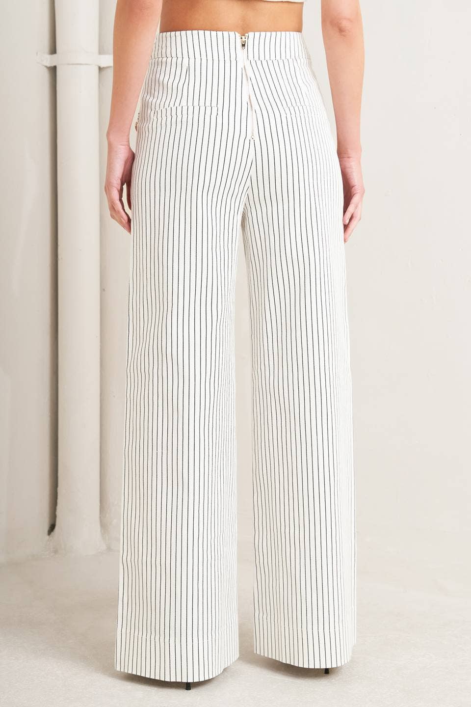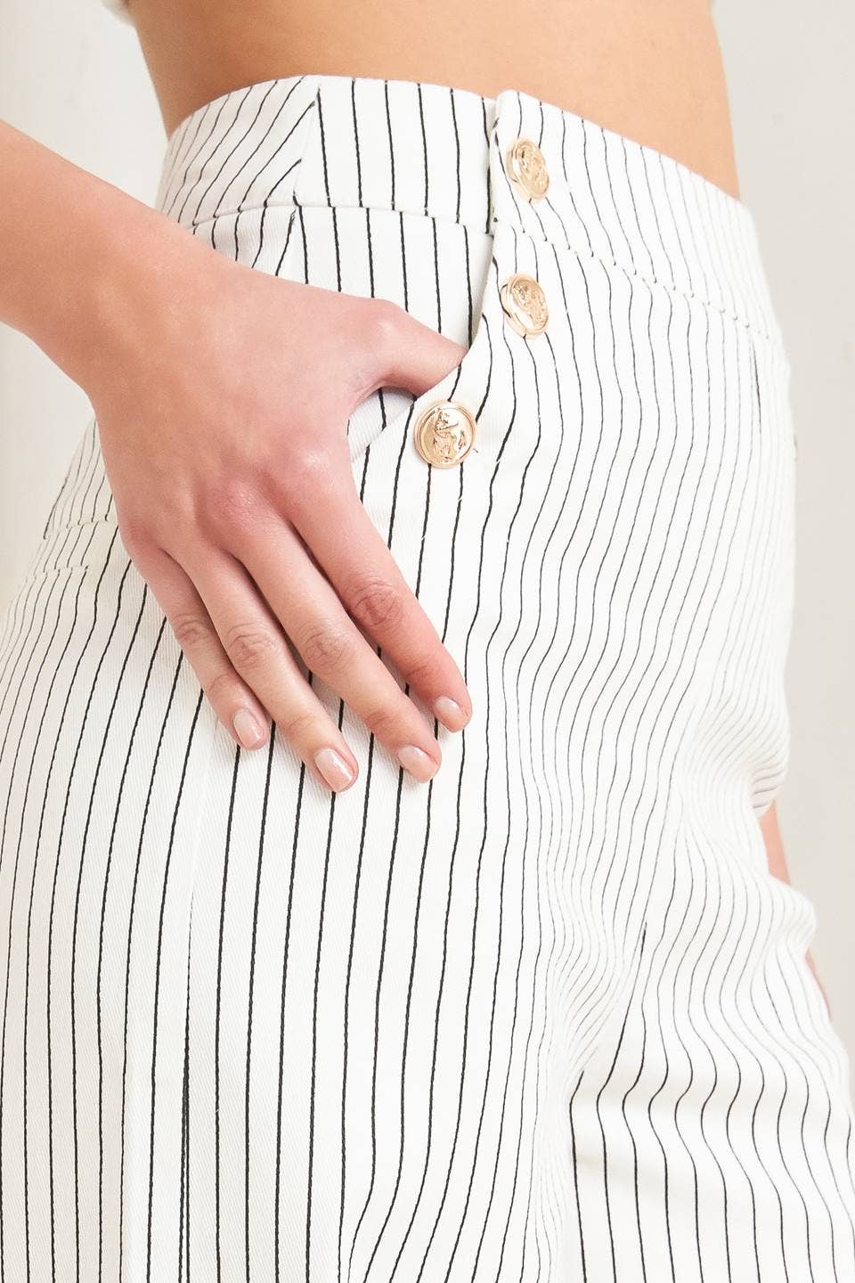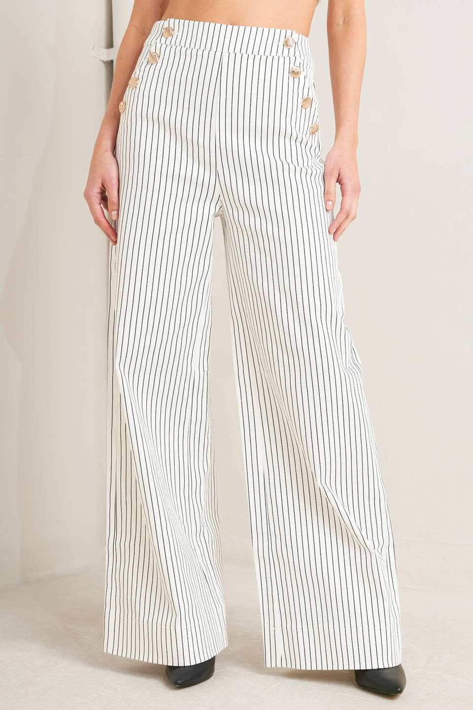 - A striped woven pant featuring side button detail, pockets, wide leg and back zipper closure.