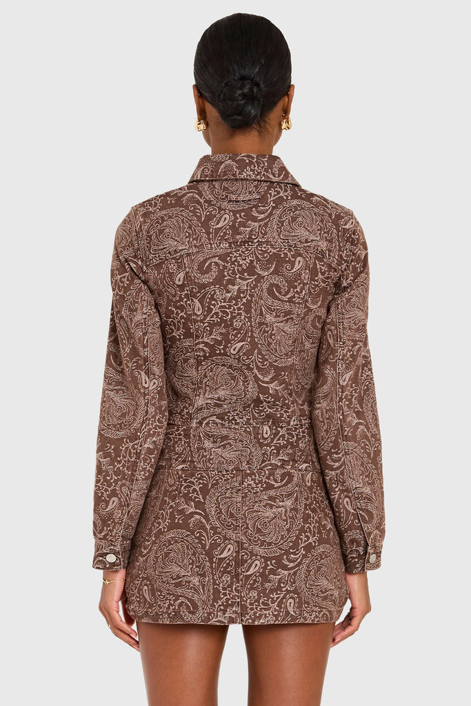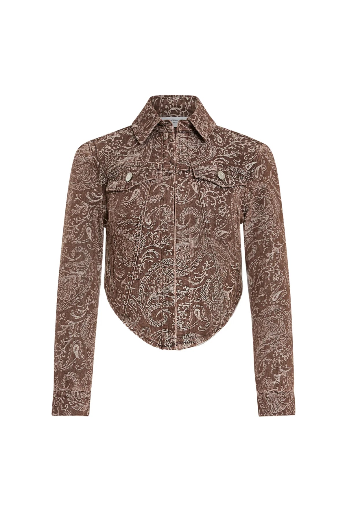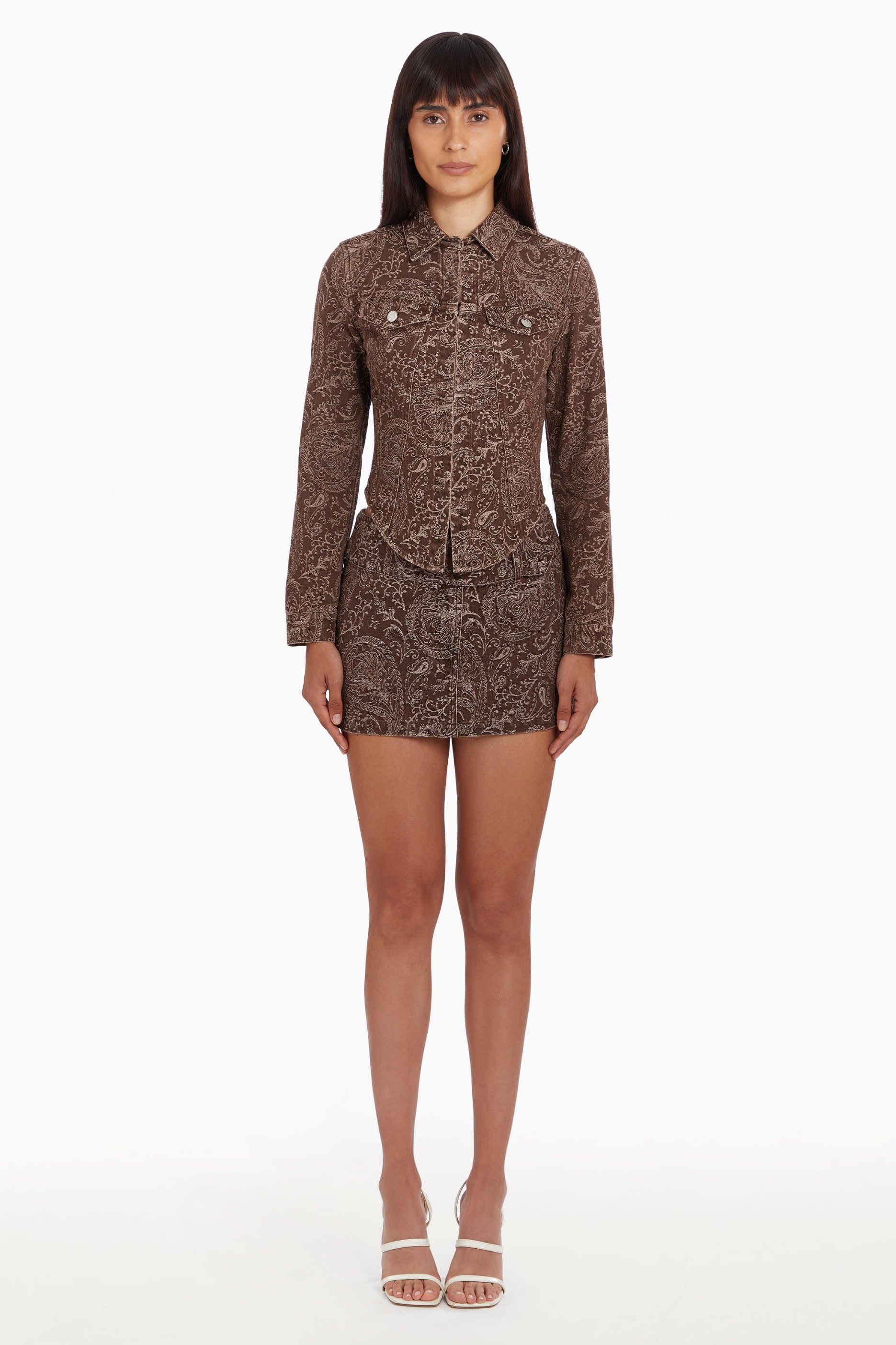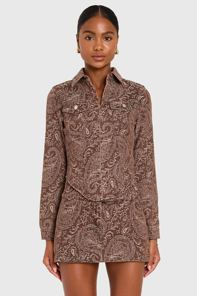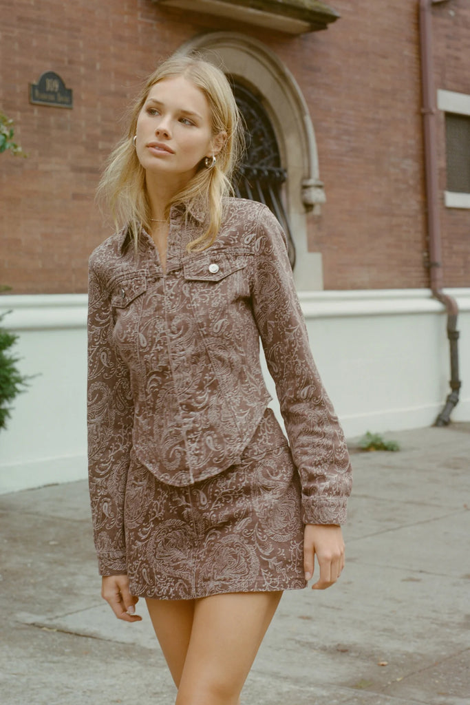 The paisley-printed denim Bristol Top is our go-to Fall layering piece. Featuring a unique hook-and-eye closure and unique corset-style, it pairs perfectly with the matching mini Dallyn Skort or your favorite pair of light wash jeans.