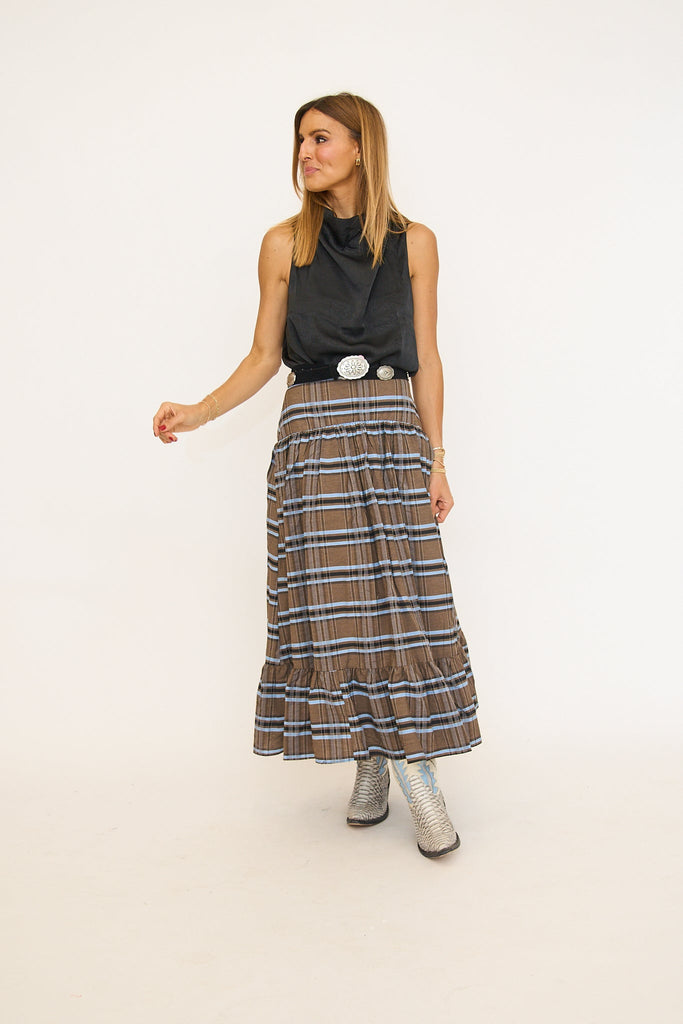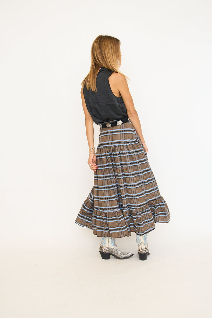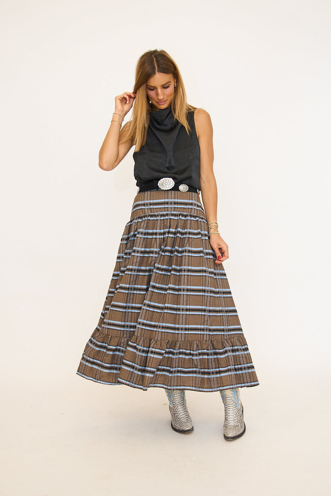 - Plaid printed maxi length skirt, falling to or just above the ankle for an elegant silhouette. The waist seam sits lower on the hips rather than at the natural waist, offering a relaxed, slightly "blouson" upper portion and flowy lower skirt.