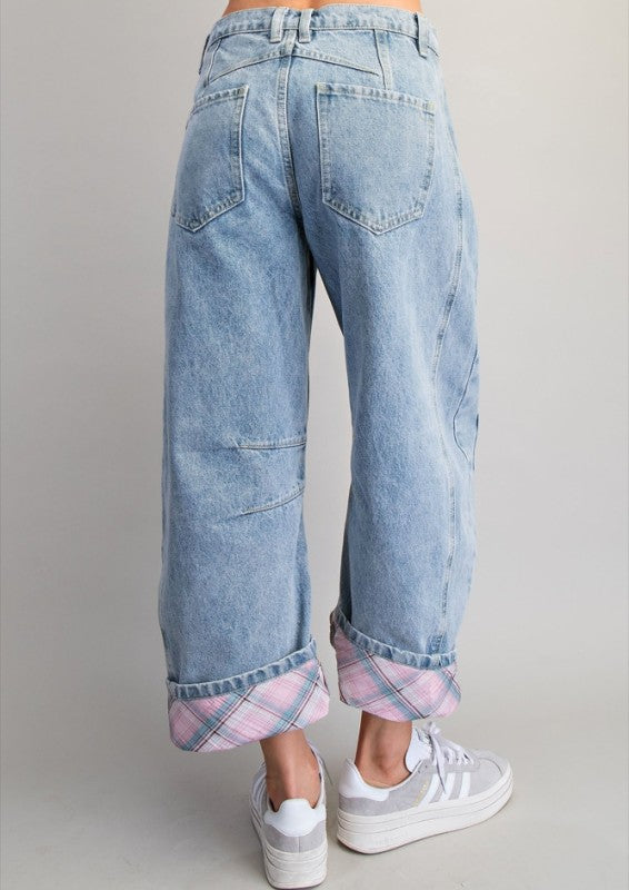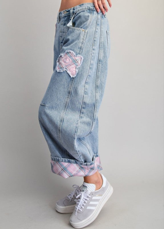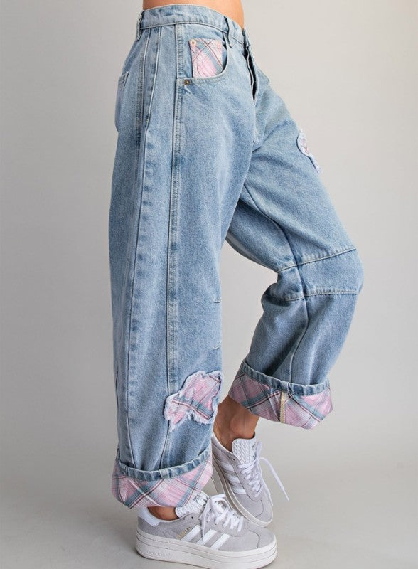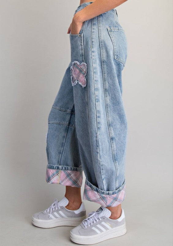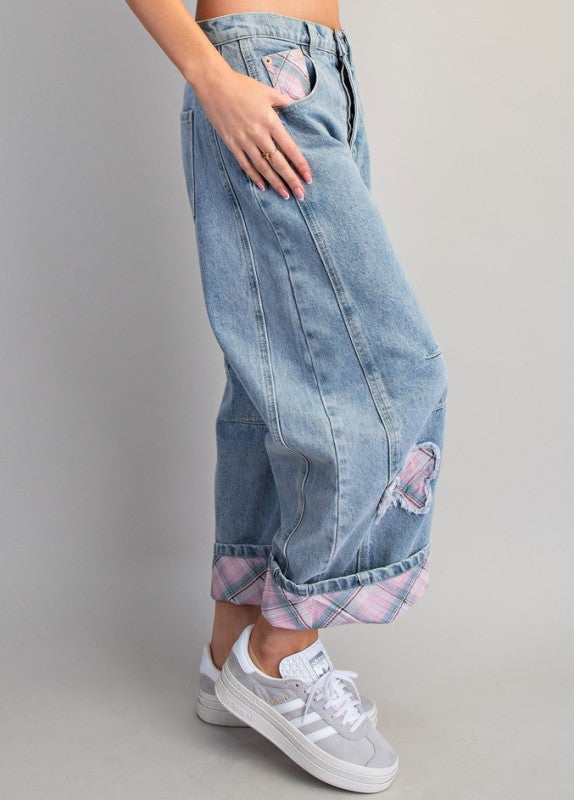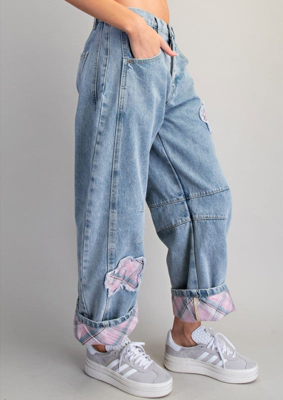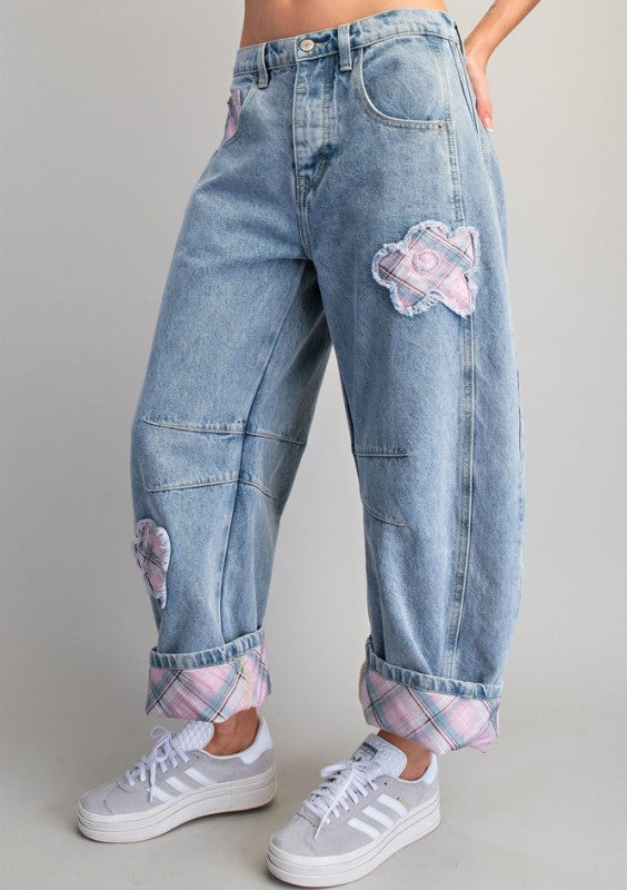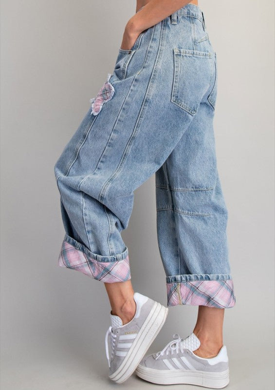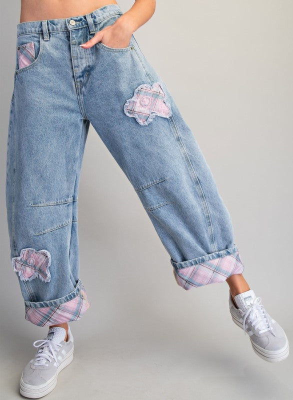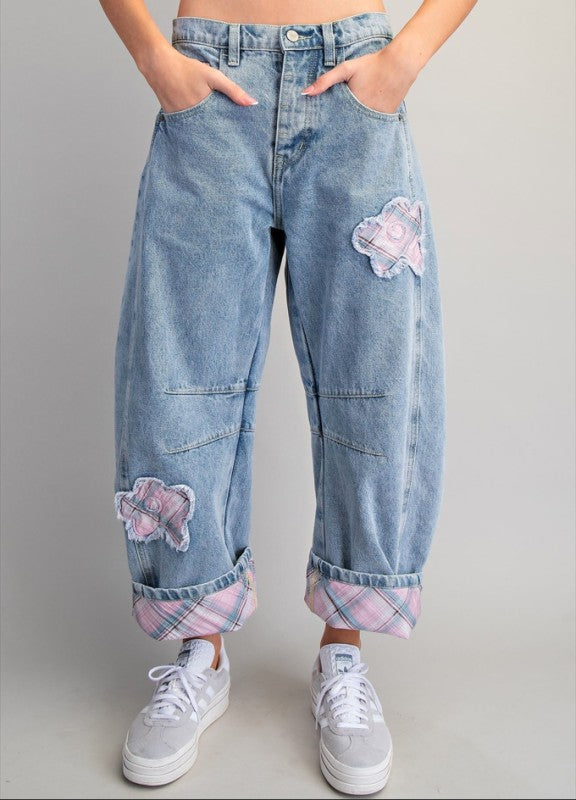 Floral Patch Plaid Contrast Barrel Jeans