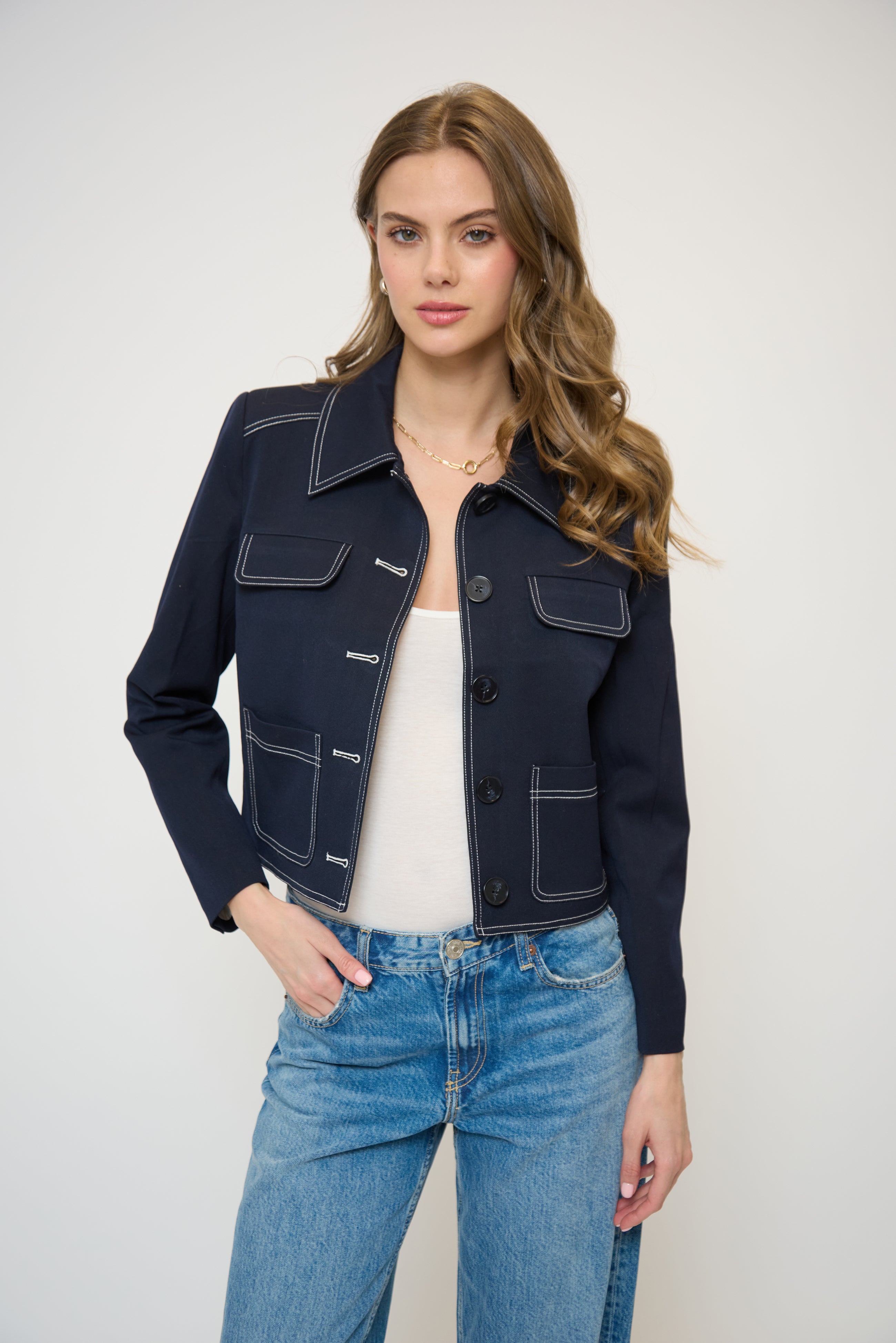 - A structured jacket with bold stitch detailing, offering a clean, modern look with four functional pocketsand a crisp finish that easily elevates casual or polished outfits.