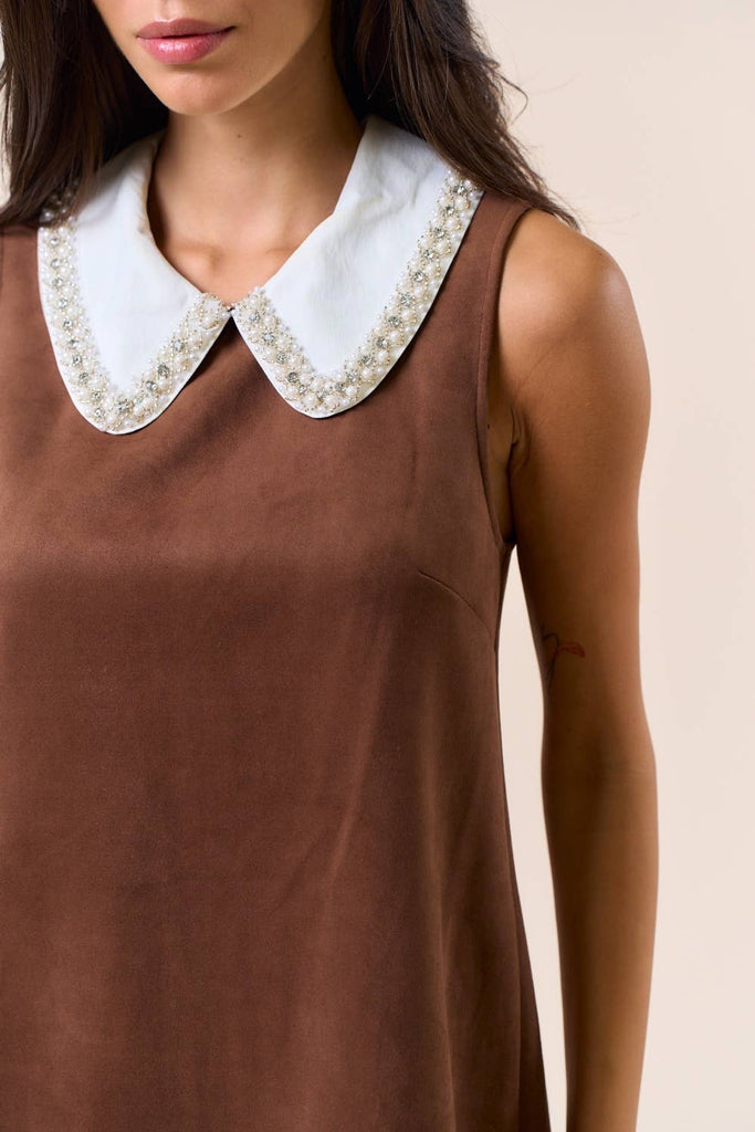 Contrast Sleeveless Mini Dress with Pearl Accent