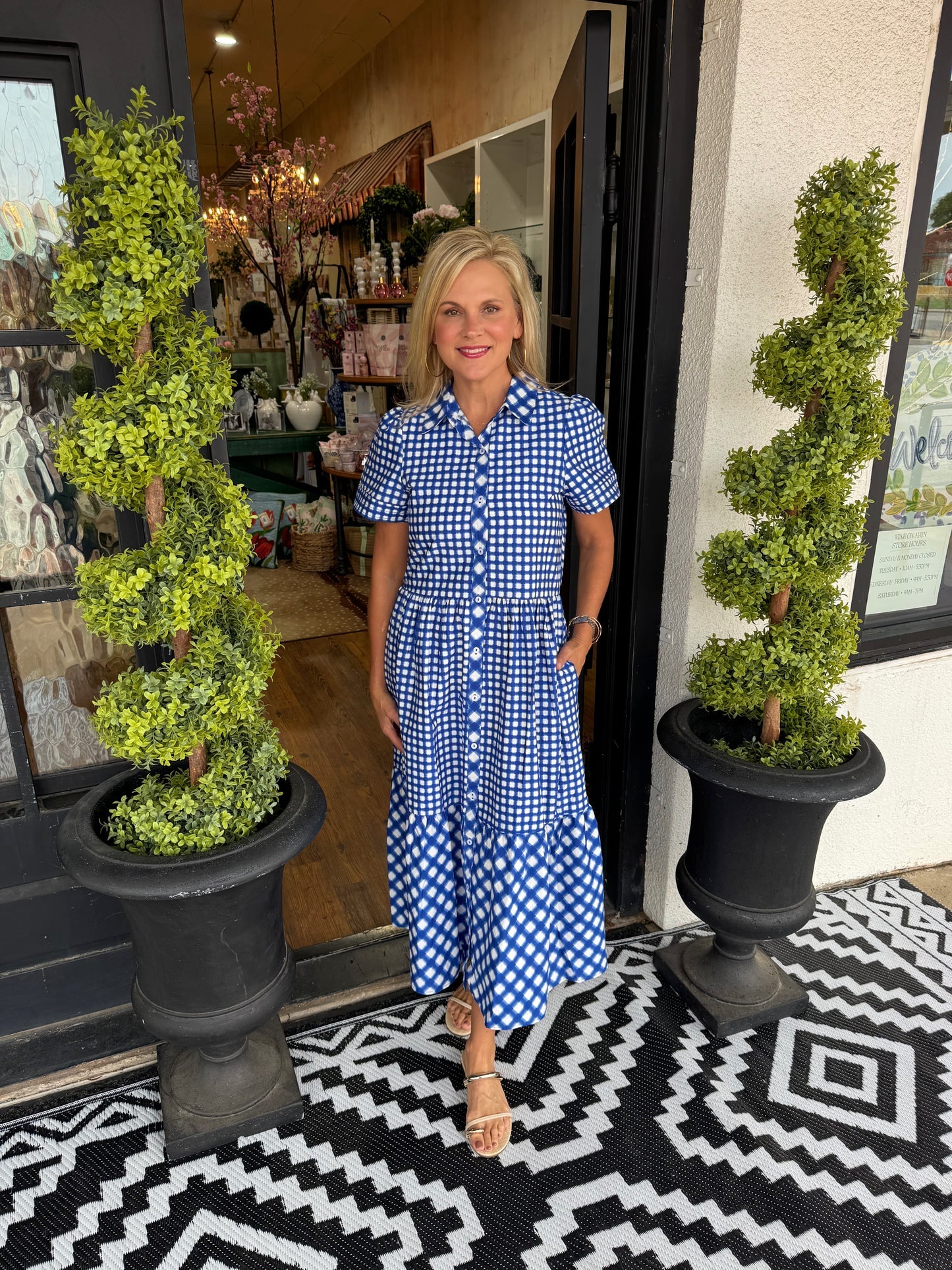 - The Jema Gingham Midi Dress in Navy is the perfect choice for summer outings. Its charming gingham pattern adds a fresh, stylish touch to your wardrobe, making you feel bright and confident. Embrace the season with a dress designed for comfort and effortless style.
