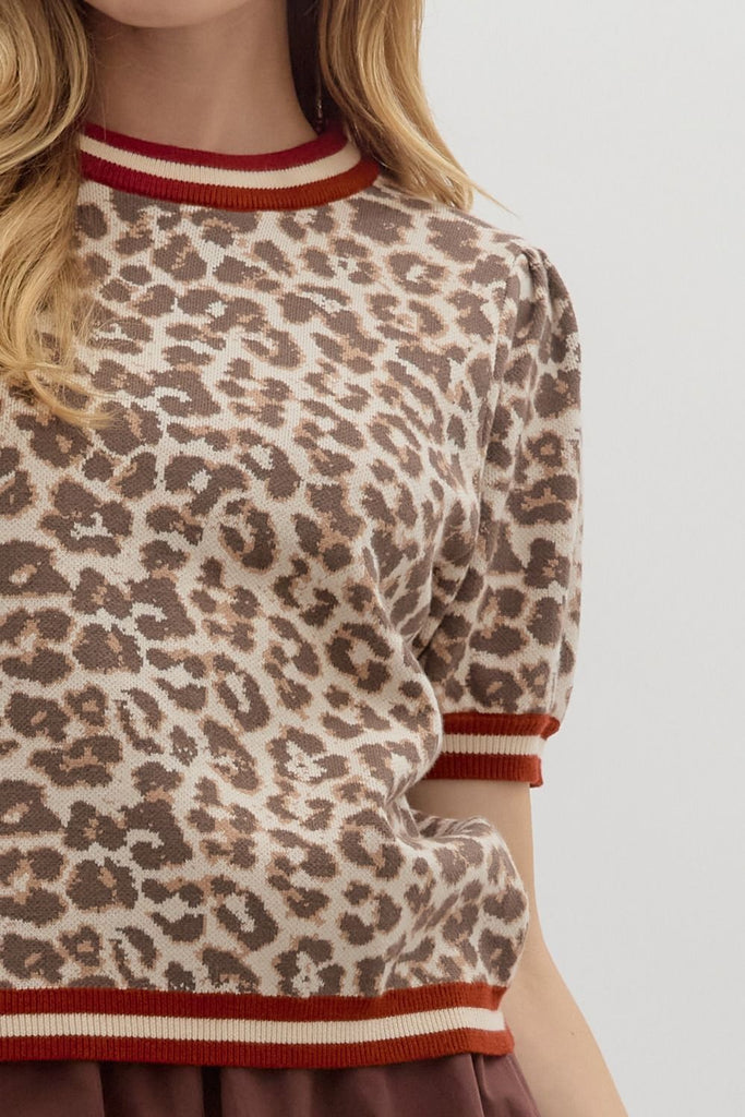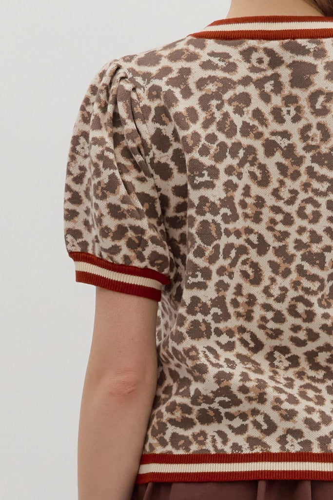 - Leopard pattern short puff sleeve featuring multicolor accent band.