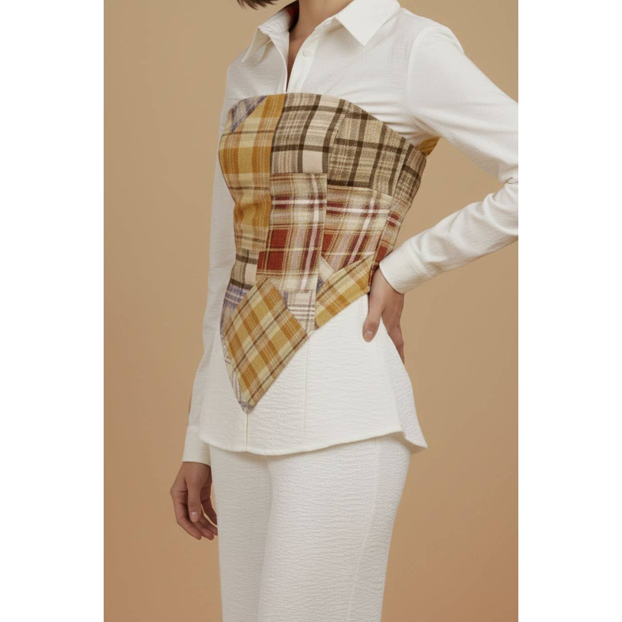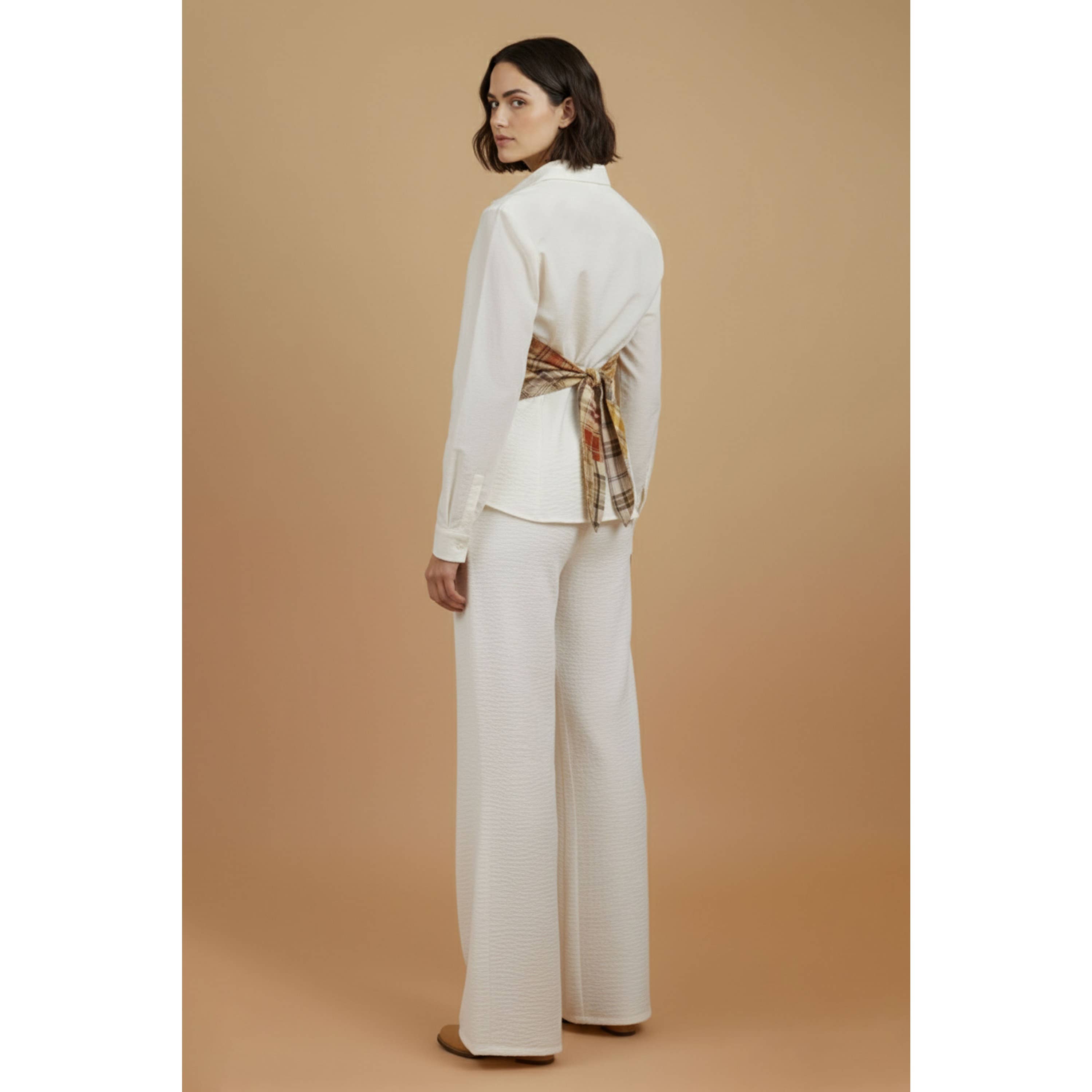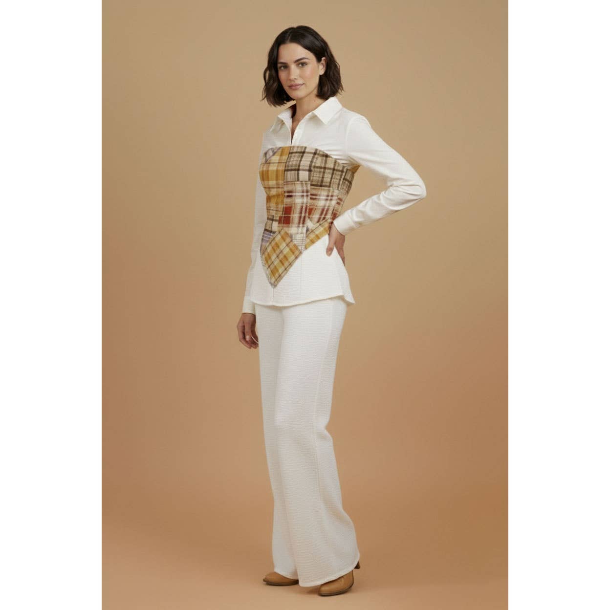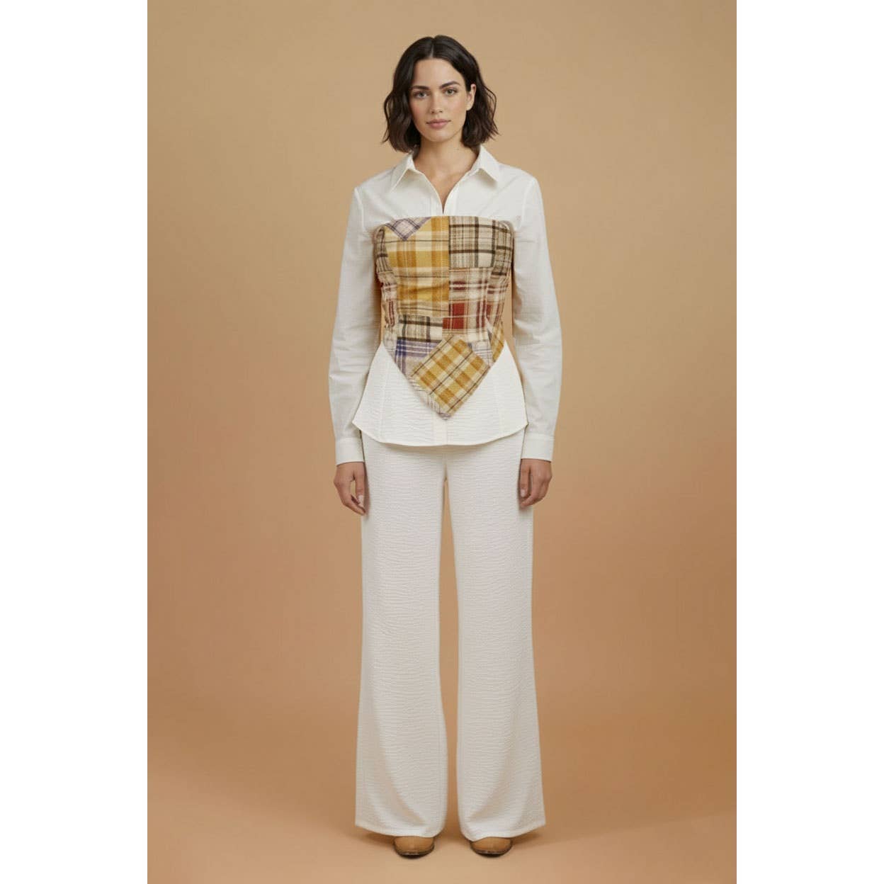 An asymmetrical mixed-texture set featuring a collared long-sleeve top with a plaid corset-inspired overlay and tie-back detail. Paired with soft wide-leg pants for a sophisticated yet relaxed silhouette.