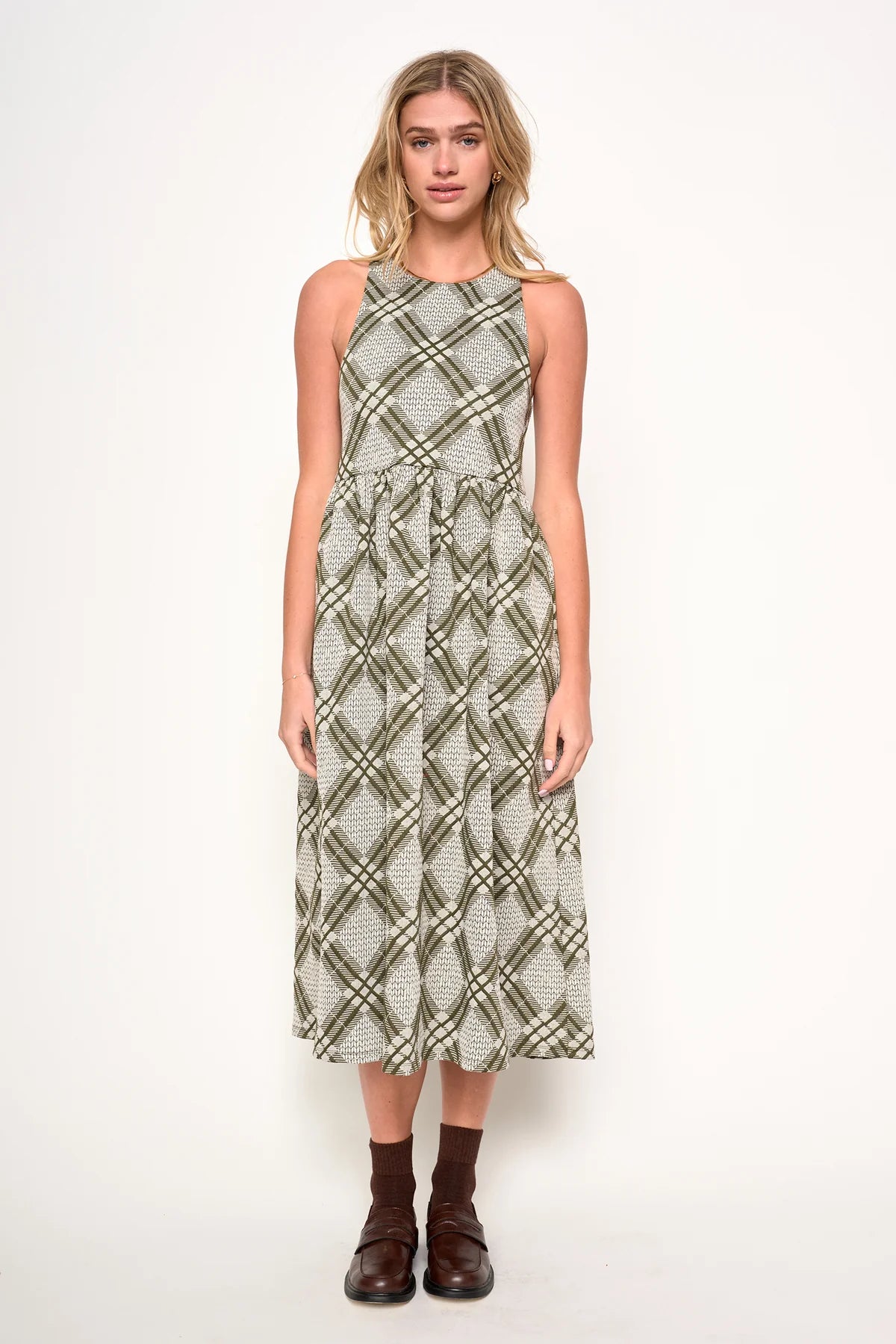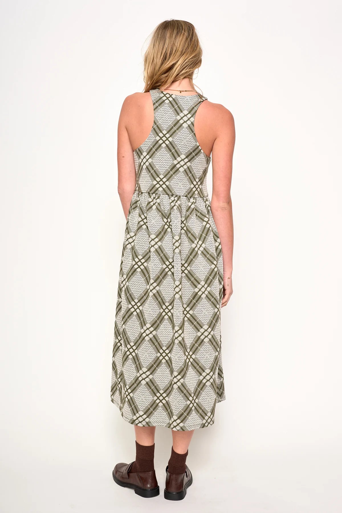 - The Renzo muscle tank dress, crafted from a chic diamond Green Plaid knit, is your go-to one-piece essential for effortless style. This midi-length dress features convenient inseam pockets and a flattering round neckline, embodying a fit-and-flare silhouette that promises both comfort and elegance. The perfect wardrobe staple, this dress combines practicality with a timeless look, making it an ideal choice for any casual outing.