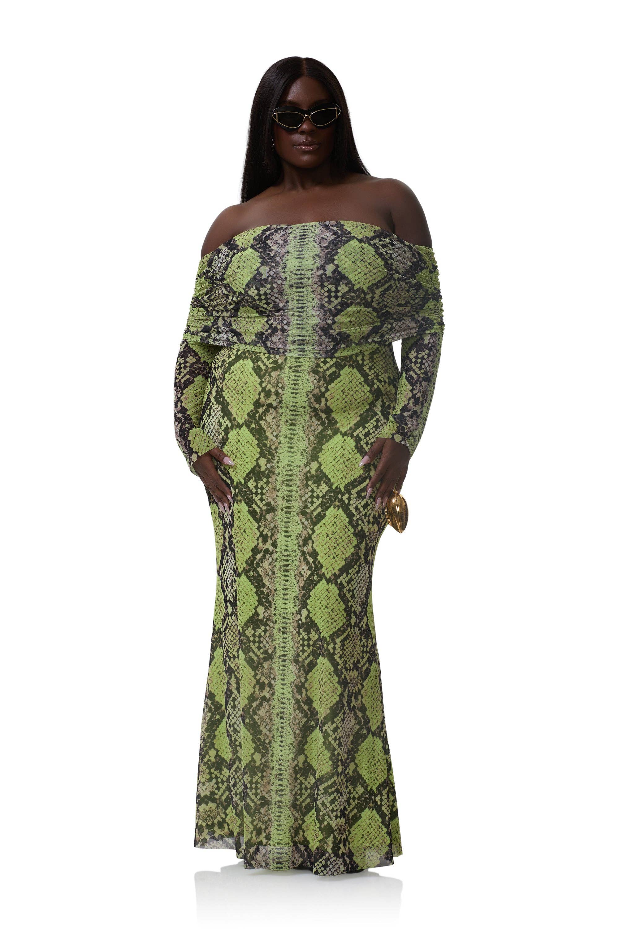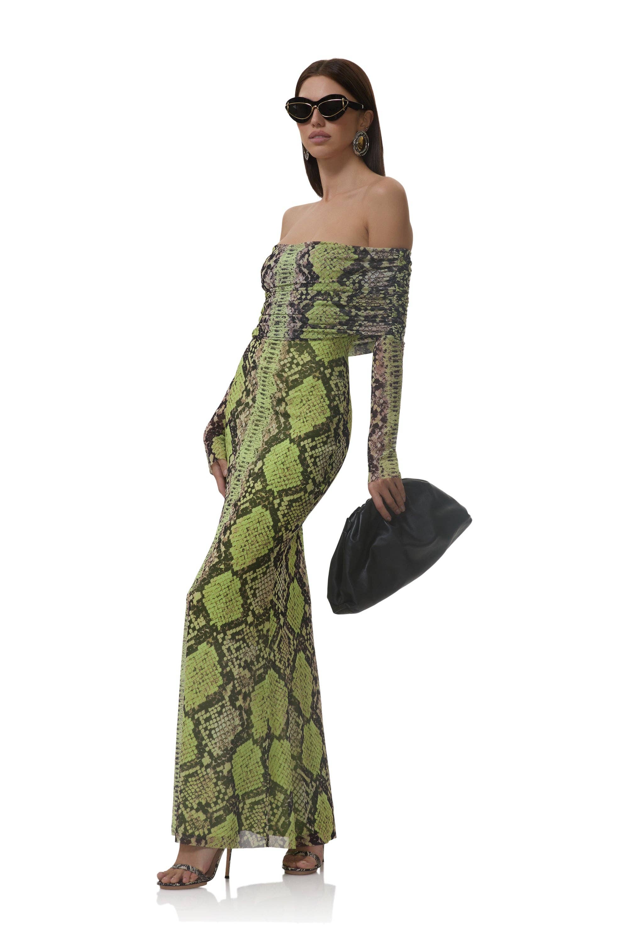 Our best selling icon for a reason, the breathtaking Thelma. Featuring long sleeves, gathered detailing, and an off-shoulder silhouette, Thelma delivers bold feminine beauty in our latest Lime Snake power mesh print.